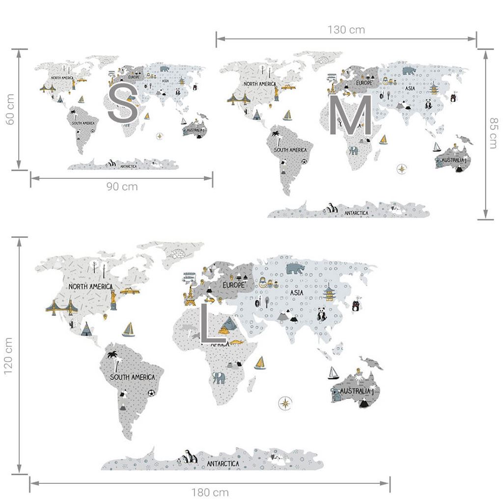 Bellissima adesivo da parete Mappa S. Le mappe del mondo grigie sono prodotti di altissima qualità, realizzati con la massima cura e attenzione ai dettagli, mantenute in colori scandinavi tenui che si integrano perfettamente nello spazio del bambino. Le mappe non sono solo un'eccezionale decorazione, ma anche un modo sensazionale di imparare giocando. I bambini scoprono i continenti, gli oceani e i punti cardinali, ma anche i monumenti e le curiosità di ciascuna regione o stato. Ogni elemento della mappa è attentamente ritagliato dal contorno e incollato singolarmente, il che facilita l'applicazione, soprattutto in caso di spazi ampi. La dimensione dell'adesivo viene misurata dopo la sua applicazione sulla parete, con i continenti distanziati appropriatamente. L'adesivo è protetto da un laminato opaco speciale, che lo protegge dai graffi durante l'uso quotidiano e allo stesso tempo facilita l'incollaggio: la pellicola è più spessa e si trasferisce più facilmente sulla parete. Se stai cercando un modo perfetto per ravvivare la cameretta, i nostri adesivi da parete sono la scelta giusta. Ordinali oggi stesso e fai felice tuo figlio.