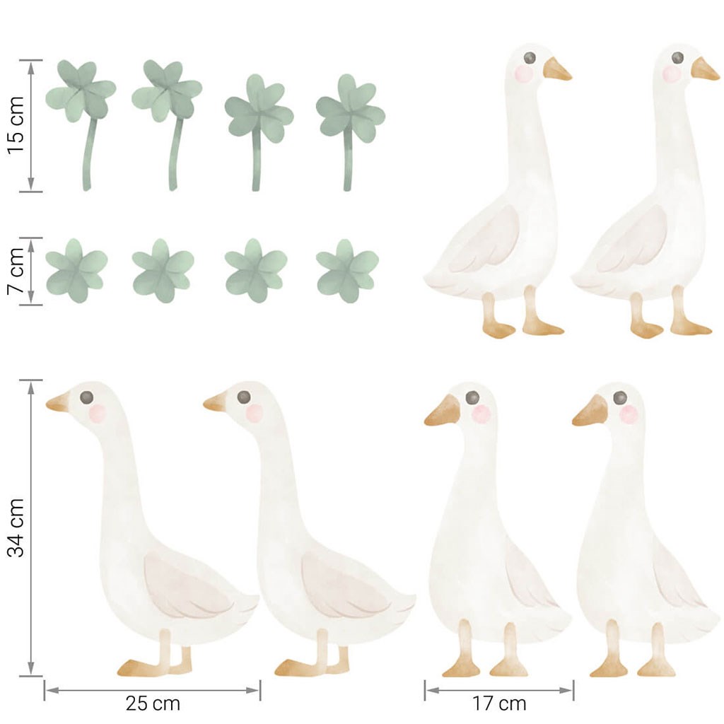 adesivi da muro con gansette (6 pz) e trifogli (8 pz). Le dimensioni esatte di ciascuna parte dell'adesivo sono indicate nell'ultima fotografia.