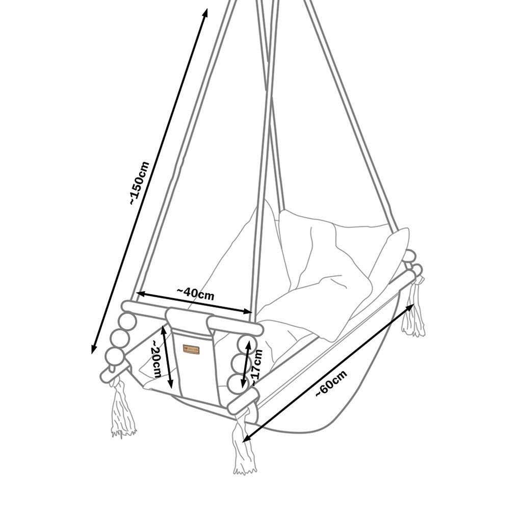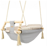 Grazie all'uso di cotone morbido al tatto, il bambino si sente accogliente, comodo e al sicuro. Le robuste corde di cotone sono dotate di ruote metalliche che consentono di installare l'altalena anche su terrazze, verande o in giardino.