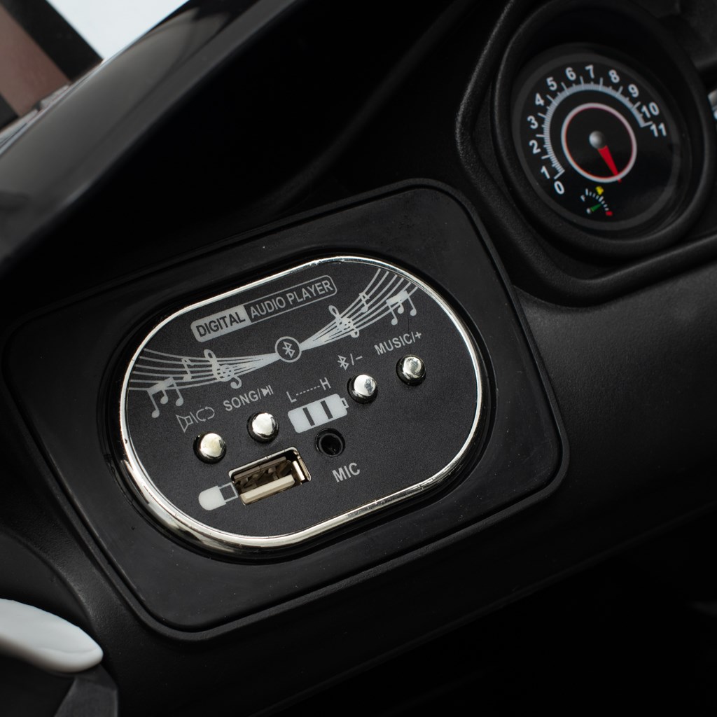 Autoletto Elettrico per Bambini Baby Mix Polizia con trazione 4x4 e batteria 12V 7Ah affronta senza problemi terreni impegnativi e salite. L'auto è dotata di un telecomando per i genitori che permette di guidare avanti, indietro, a sinistra e a destra. È inoltre equipaggiata con un pannello musicale che ha melodie e canzoni precaricate e consente anche il collegamento USB. Sul cruscotto a destra si trova un display LCD imitato e i pulsanti per la guida e il pulsante di accensione.