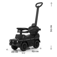 Il passeggino per bambini con barra di spinta MERCEDES G350d è realizzato con licenza del gruppo MERCEDES. Il tuo piccolo racer si sentirà come in un vero SUV. Il passeggino è realizzato con attenzione a ogni dettaglio e alla qualità dei materiali utilizzati. Il suo design catturerà l'attenzione non solo di ogni bambino, ma anche dei genitori. Questo passeggino aiuta a sviluppare le capacità motorie del bambino e il tuo piccolo racer si divertir à molto. L'auto ha un volante a tre razze con pulsanti che suonano diverse melodie, il rumore del motore o un clacson. È destinato sia ai bambini più piccoli che sanno già sedersi, sia a quelli che hanno già imparato a camminare. Il passeggino ha ruote anteriori rotanti, una sedia ampia e confortevole con spazio di archiviazione e una barra di spinta pratica e robusta, che consente di controllare il passeggino. La barra di spinta, i braccioli e i poggiapiedi possono essere rimossi, permettendo così al bambino di utilizzare l'auto come un passeggino classico. Le batterie non sono incluse (2x AA 1.5V).