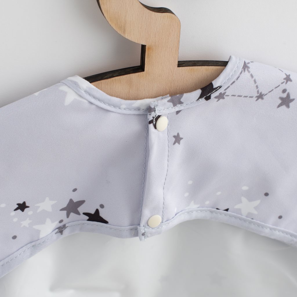 Bavaglino per bambini con maniche lunghe New Baby protegge efficacemente i vestiti del tuo bambino da macchie durante i pasti e il gioco. Realizzato in materiale leggero e morbido. Il bavaglino ha una comoda chiusura a 2 bottoni e una pratica tasca. Il bavaglino è cucito con due strati di materiale. Lo strato inferiore è realizzato in materiale impermeabile. In caso di sporco, il bavaglino può essere pulito con un panno umido o lavato in lavatrice.