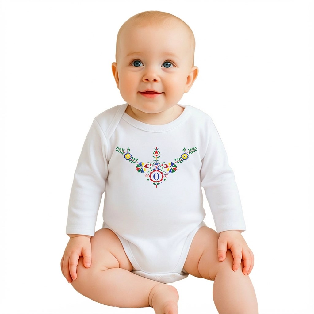 Originale, stiloso e comodo body per bambini con un meraviglioso stampato folkloristico del marchio ceco New Baby, che unisce perfettamente tradizione e design moderno. Un'ottima scelta per i piccoli amanti della tradizione popolare, che apprezzano materiali di alta qualità e un aspetto unico. Il motivo folkloristico, ispirato a motivi tradizionali, conferirà un tocco di classe al vostro bambino.