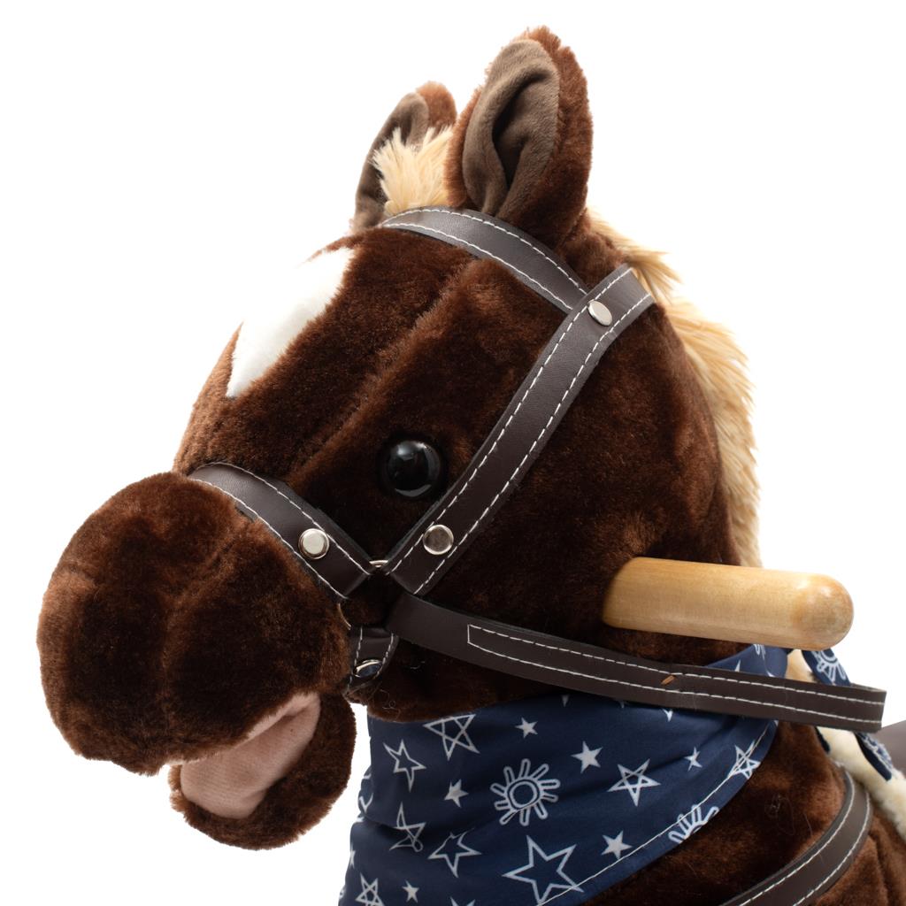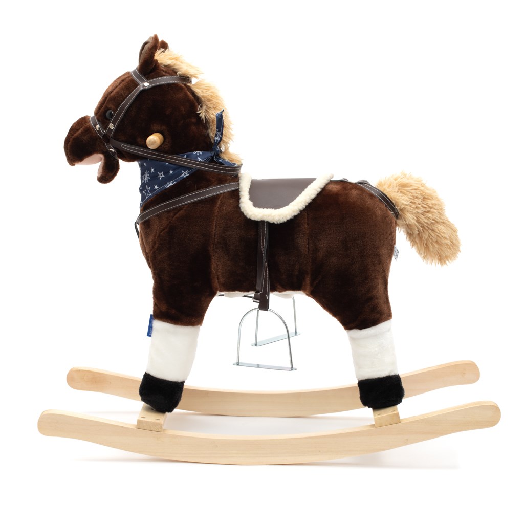 Il morbido cavallo a dondolo Baby Mix è stato progettato per i bambini che amano l'avventura. Sembra un vero cavallo, così il tuo bambino si sentirà un vero cavaliere. Il cavallo è realizzato in morbido peluche, ha una sciarpa decorativa attorno al collo ed è dotato di robuste barre a dondolo in legno, il cui profilo protegge il bambino da ribaltamenti. La comoda sella, le robuste redini, i staffe in metallo, i manici in legno e le stabili barre a dondolo garantiranno ai tuoi cowboy ancora maggiore stabilità e comfort mentre dondolano. È realizzato in morbido materiale di peluche, le robuste barre o i manici in legno possono essere facilmente smontati. Premendo i pulsanti sulle orecchie, il cavallo muove la coda, muove la bocca, emette suoni di galoppo, nitrendo e cantando una canzone da cowboy. Tre batterie AA da 1,5 V necessarie vengono inserite in un alloggiamento situato sulla pancia del cavallo e non sono incluse nella confezione. Durante il dondolio, il bambino impara a coordinare i movimenti del proprio corpo con quelli del cavallo, il che migliora l'equilibrio generale e la motricità del bambino.