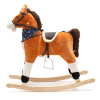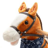 Un bellissimo cavallo a dondolo con una sciarpa rossa attorno al collo. Premendo le orecchie, il cavallo muove la coda, apre la bocca, emette suoni di un cavallo che galoppa o canta una canzone. La sella comoda, il morso resistente, le maniglie di legno o gli staffe in metallo offrono ai vostri cowboy maggiore stabilità e comfort durante l'inclinazione. È realizzato in morbido materiale di peluche, le barre di legno o le maniglie possono essere facilmente smontate. Le batterie si inseriscono in un vano situato sulla pancia del cavallo.
