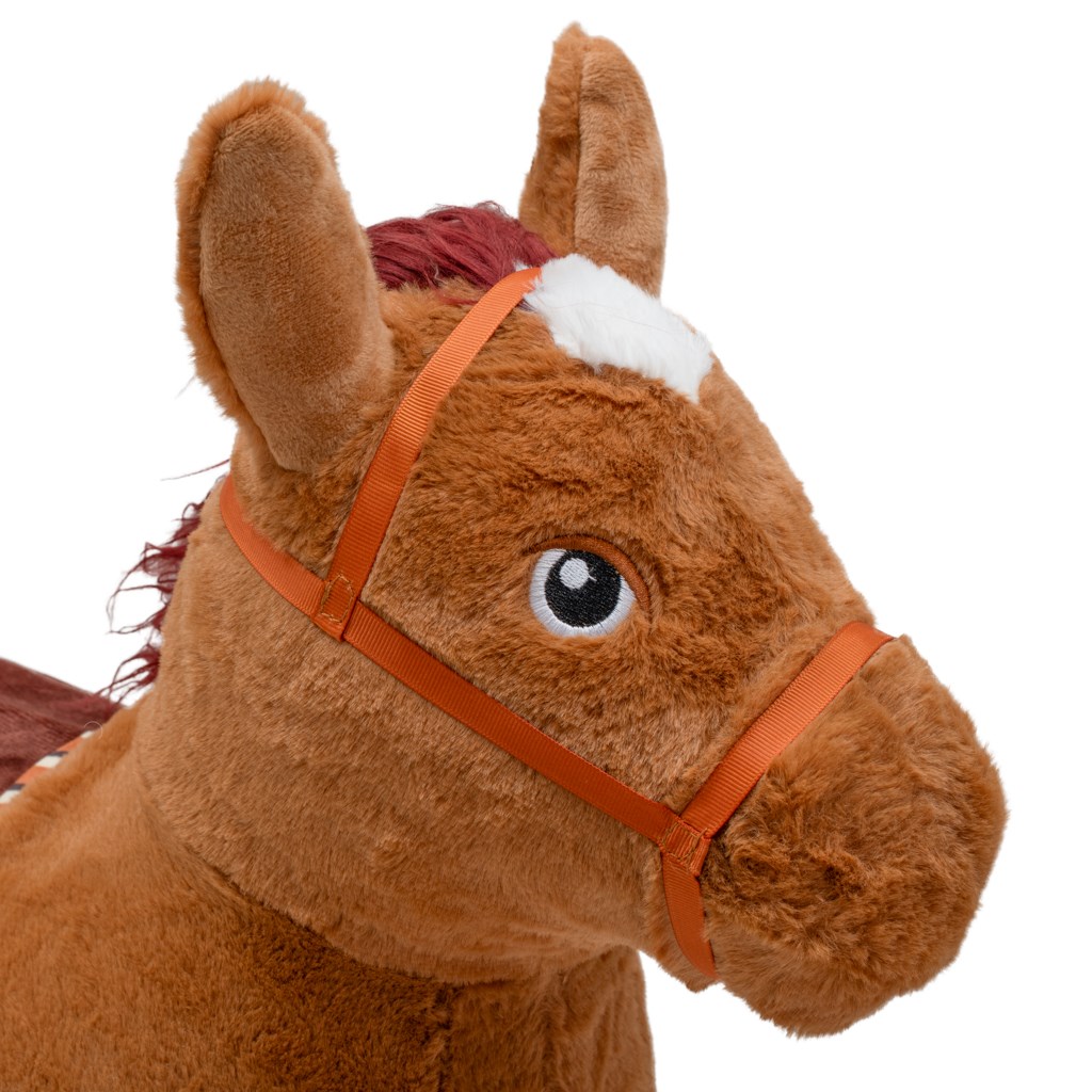 Il cavallo da salto è rivestito con un morbido peluche antiscivolo, molto piacevole al tatto. È dotato di un modulo sonoro – premendo tra le orecchie emette un suono realistico da cavallo, il che stimola l'immaginazione e incoraggia al gioco attivo.