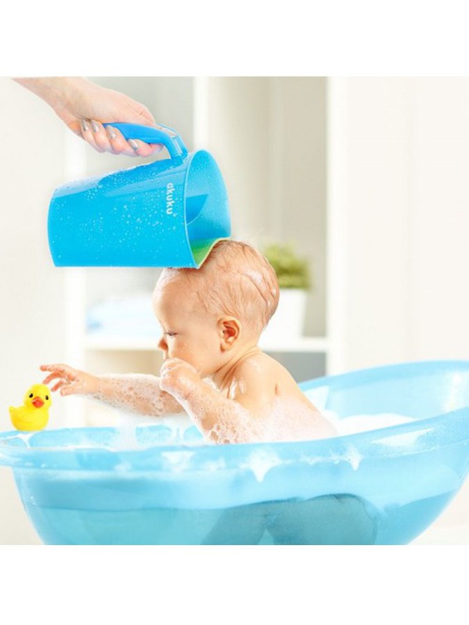 Contenitore molto pratico per il lavaggio dei capelli per bambini e neonati. Il bordo elastico del contenitore consente un risciacquo sicuro dei capelli - non entra niente negli occhi del bambino. Il contenitore è molto facile da usare e le due camere permettono un risciacquo completo dell'intera testa. Adatto per bambini dalla nascita. Privo di BPA.
