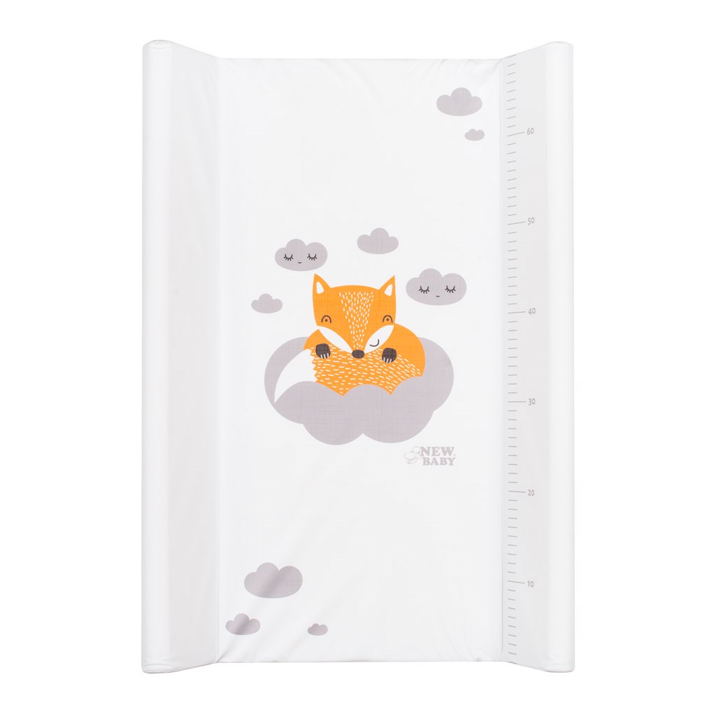 Tappetino per cambio New Baby, pratico e sagomato, realizzato in materiale plastico impermeabile con un'immagine di volpe e nuvolette. Prodotto del marchio ceco. Il tappetino è imbottito in poliestere, dispone di lati rialzati ed è utilizzabile su una cassettiera o in altri luoghi per il cambio, grazie al suo peso leggero è facile da trasportare. È realizzato con film di alta qualità certificato, privo di sostanze nocive e delicato su qualsiasi pelle di bambino. Senza base rigida. Dimensioni: circa 50x70 cm, spessore circa 2 cm, altezza dei bordi 8 cm.