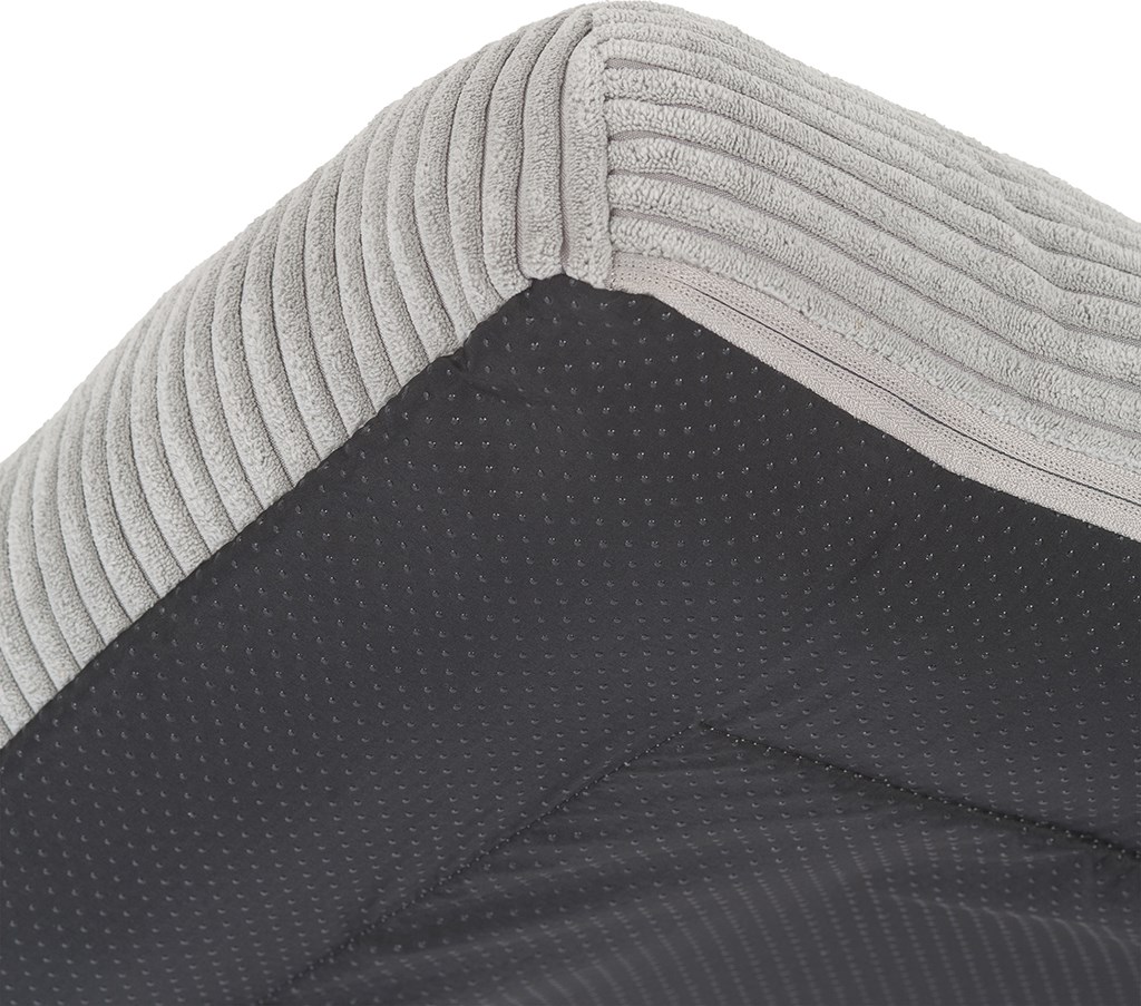 La fodera è realizzata in morbido e piacevole tessuto a coste, che è resistente e allo stesso tempo resistente all'usura e all'abrasione. Il fondo rivestito con tessuto antiscivolo offre anche un'ottima aderenza e rende difficile il movimento indesiderato del letto sul pavimento.