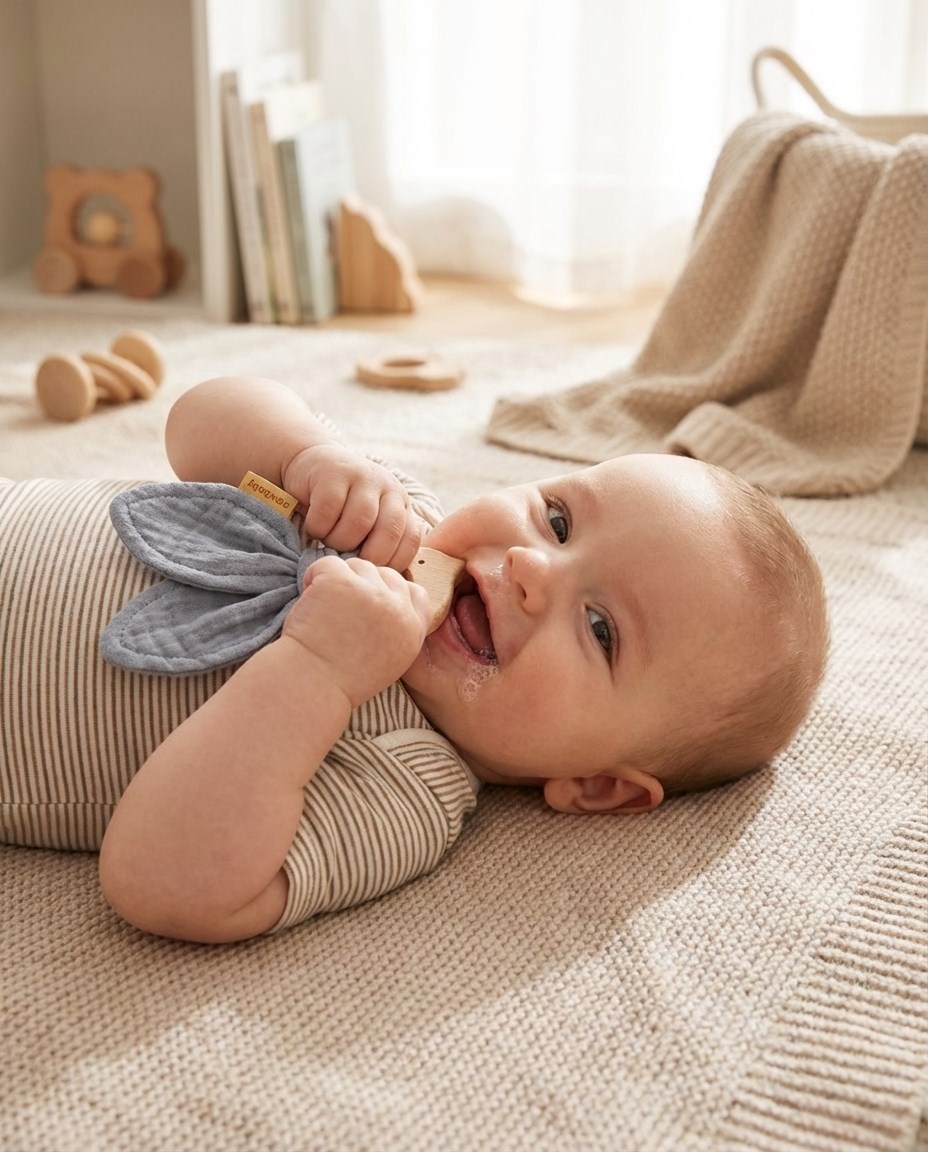 Il giocattolo da dentizione con il panno in mussola è un set ideale quando il bambino sta mettendo i dentini. Il giochino è realizzato in legno di faggio ecologico e morbido tessuto in mussola. Completamente sicuro per i bambini, offre un sollievo rinfrescante durante la dentizione. Può essere utilizzato anche come giocattolo per neonati. Il giocattolo da dentizione si abbina perfettamente ai nostri altri prodotti in mussola, creando così un bellissimo set da regalare a una festa per bambini.
