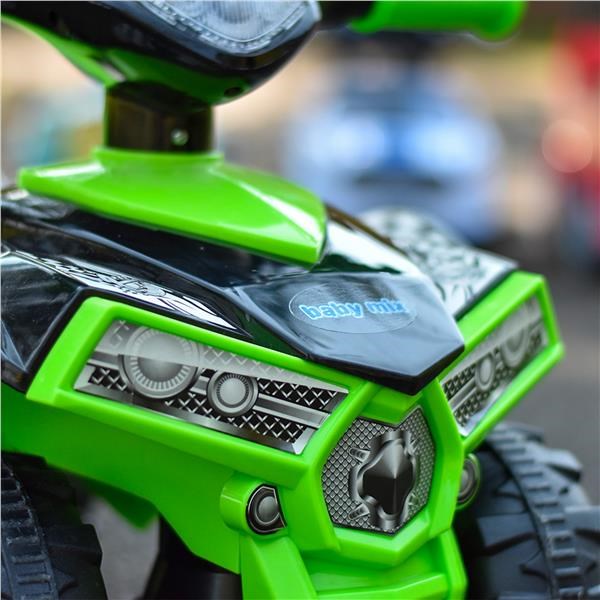 Fantastica Quattro Ruote Baby Mix con tre melodie, clacson e luci lampeggianti sui manubri. La quadricicletta ha colori vivaci ed è realizzata in plastica di alta qualità e resistente. Questo veicolo aiuta a sviluppare le capacità motorie del bambino e garantirà tanto divertimento e gioia. È adatta per i più piccoli che già sanno sedere e per i bambini che hanno già imparato a camminare. Con la quadricicletta, tuo figlio si divertirà un sacco. La nostra super quadricicletta ha un aspetto fantastico, una comoda e ampia seduta, un manubrio largo e grandi ruote in plastica. È dotata di un clacson colorato e di un pulsante con tre melodie memorizzate. Le batterie non sono incluse nella confezione (2x AA 1.5V). I colori degli adesivi possono variare a seconda dell’offerta attuale.