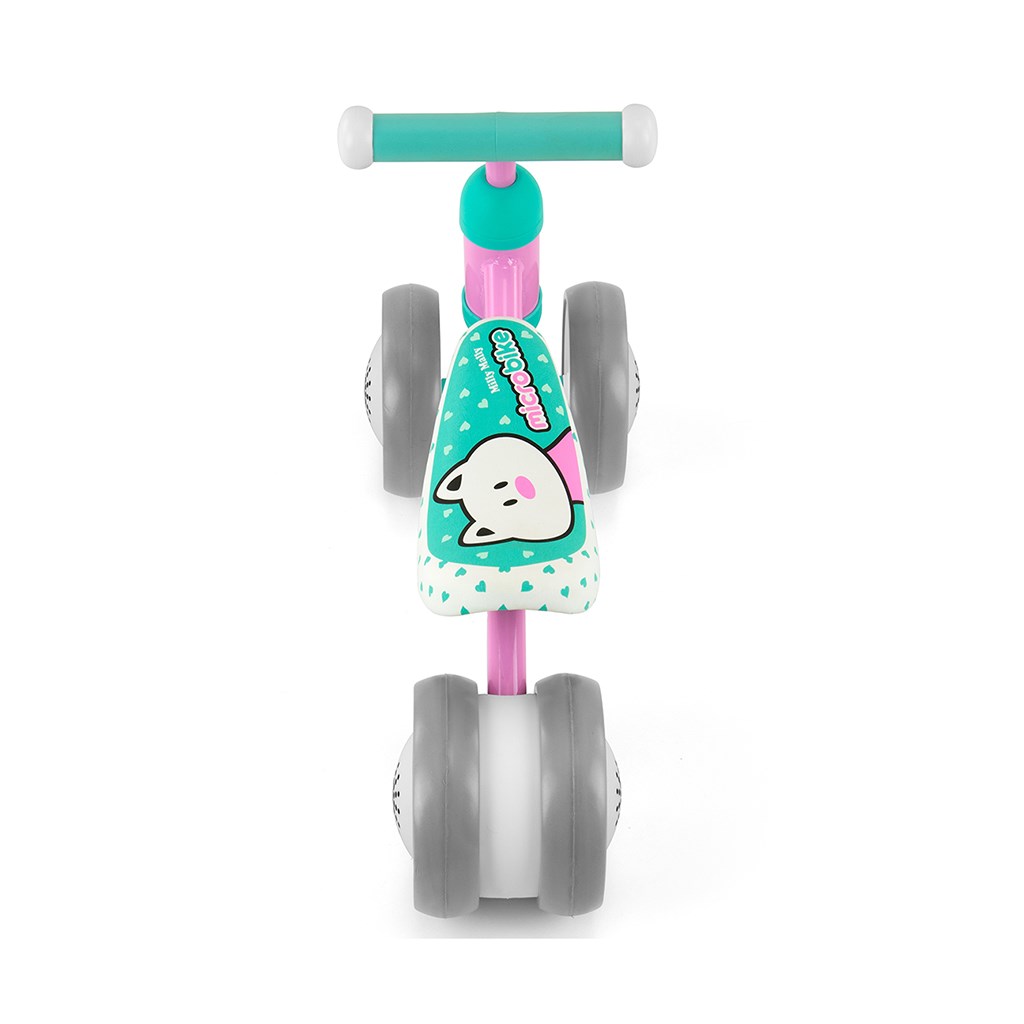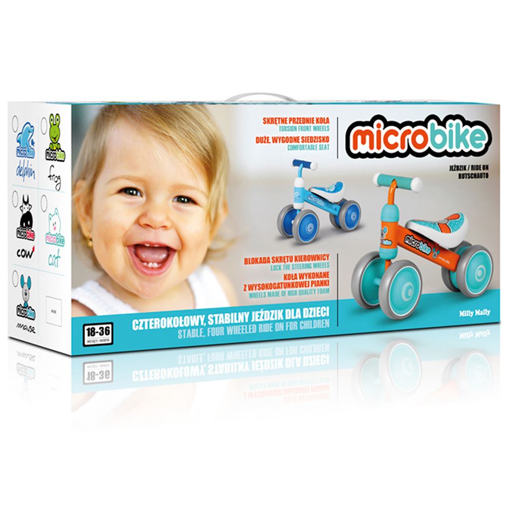 Dondolo per bambini Milly Mally Micro. Il dondolo è ideale quando il bambino inizia a imparare a mantenere l'equilibrio. È realizzato in materiale metallico per garantire al bambino divertimento durante la guida ed è arricchito da colori vivaci. È estremamente leggero, molto stabile e di dimensioni contenute, adatto sia per uso domestico che all'aperto. Le ruote sono in schiuma, antiscivolo e possono essere utilizzate su varie superfici. È la migliore alternativa per una bicicletta con rotelle laterali, quindi sarà molto più facile passare a una bicicletta tradizionale in un secondo momento. La bicicletta è priva di pedali e freni, consentendo al bambino di concentrarsi principalmente sul mantenere l'equilibrio e sul percorso. Design bello e moderno. Il sedile è decorato con un'immagine di un simpatico animale. Ideale per i più piccoli.