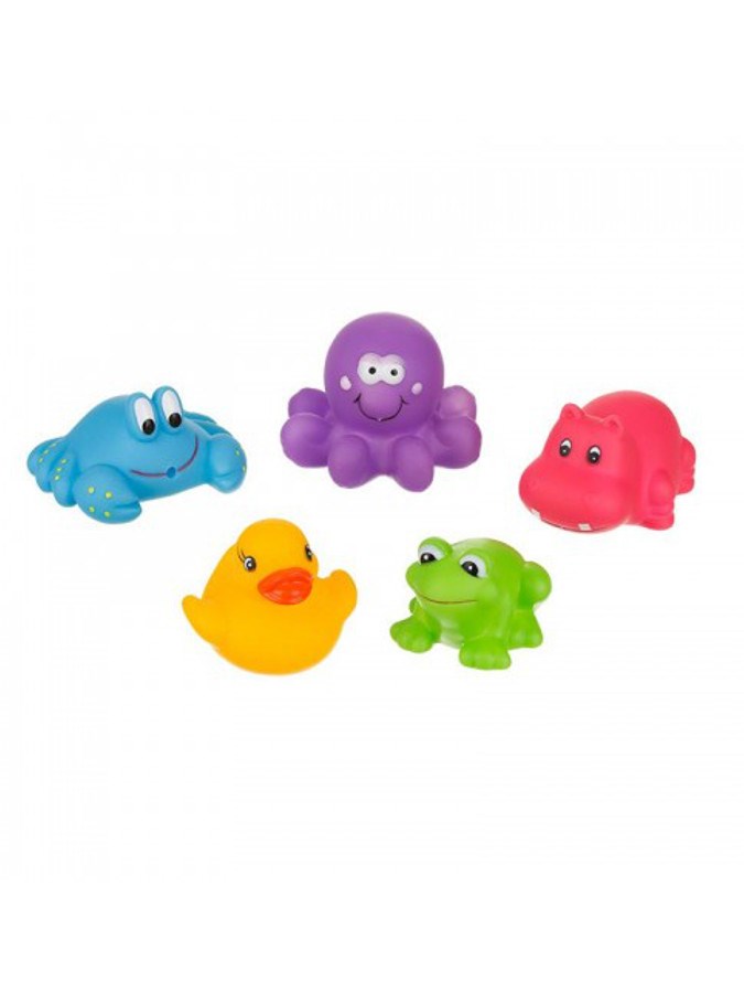Giocattoli colorati per il bagnetto Akuku. Set di 5 adorabili giocattoli colorati - paperella, rana, ippopotamo, granchio, polpo. Ideali per giocare nella vasca da bagno. I colori vivaci catturano l'attenzione dei nostri piccolini. Ogni giocattolo ha un'apertura da cui è possibile spruzzare acqua. Le forme arrotondate garantiscono la sicurezza durante il gioco. Realizzati con materiali sicuri e di alta qualità, privi di bisfenolo A. Altezza dei giocattoli da 4 a 5 cm.
