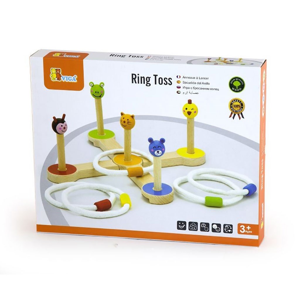 Gioco da lanciare ad anelli pieghevole. Due modalità di collegamento delle due basi principali per un divertimento maggiore durante il gioco insieme. Include 2 basi principali, 5 figurine di diversi simpatici animali e 5 anelli con perline di diversi colori.