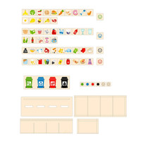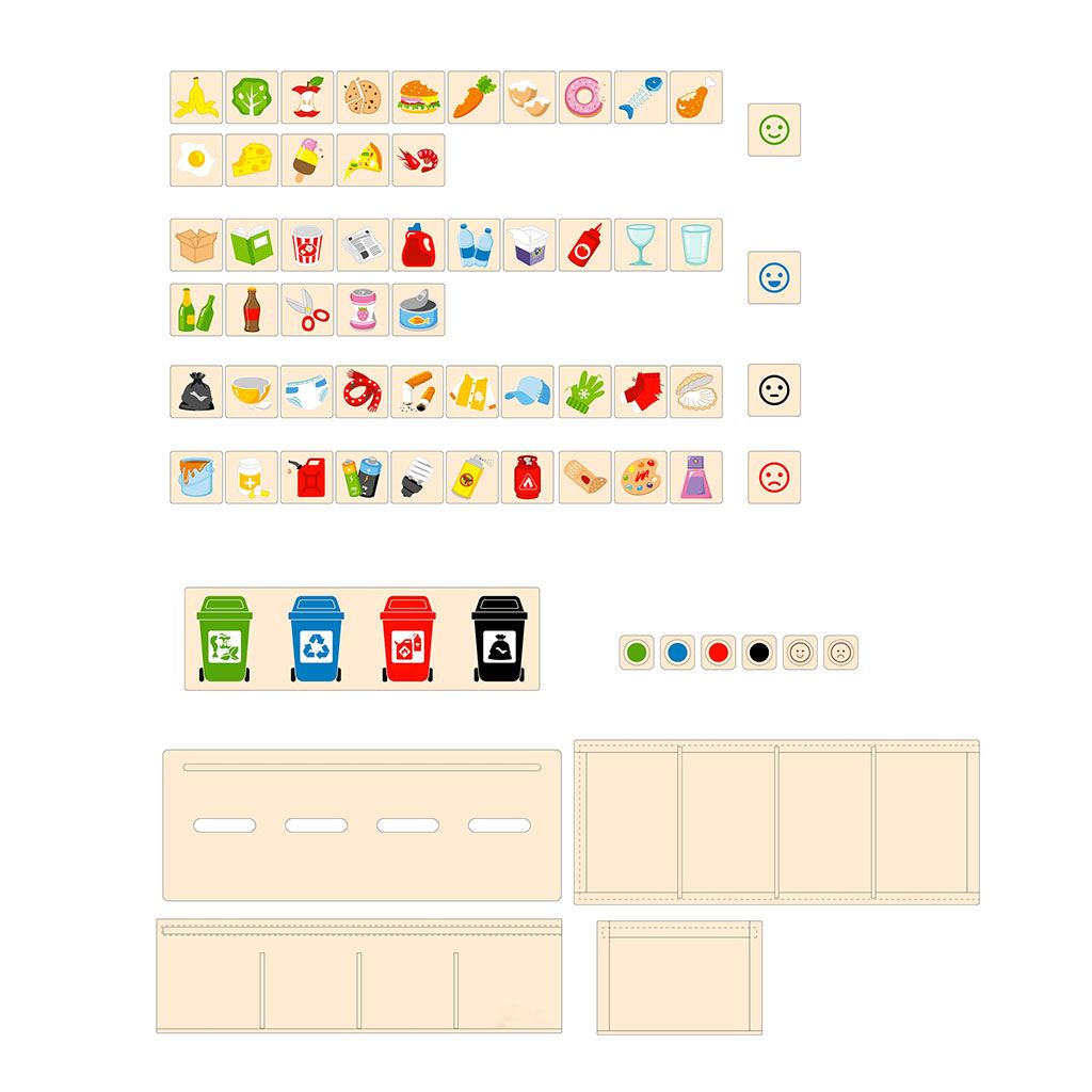 Un giocattolo classico in versione moderna, destinato ai bambini a partire dai 3 anni. È composto da 50 piccole schede di legno con immagini e da una scatola di legno chiusa con un coperchio dotato di aperture. Ogni scheda presenta da un lato un'immagine di rifiuti diversa e dall'altro un'emoji del colore corrispondente al tipo di rifiuto (cestino), a cui appartiene. Il kit include anche un'altra tessera più grande con un'immagine di cestini in 4 colori. Questa dovrebbe essere fissata al coperchio, in modo che i cestini stampati indichino l'apertura corrispondente per inserire le piccole tessere. Il set include anche 2 dadi.