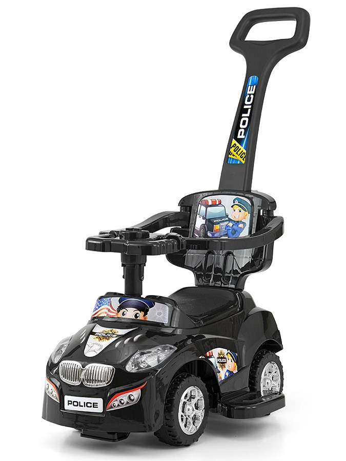 Giocattolo per bambini Milly Mally Happy. L'auto ha un pulsante sul volante che, una volta attivato, suona melodie e un pulsante che emette il suono del clacson. La giostrina può essere utilizzata come un cavalcabile, oppure, aggiungendo il manico di guida, il poggiapiedi e le maniglie, puoi trasportare il tuo bambino e tenerlo sotto controllo. È realizzata in plastica di alta qualità. È un giocattolo fantastico e sicuro. La forma del giocattolo aiuta a sviluppare le capacità motorie del bambino mentre impara a camminare. I bordi arrotondati e le ruote robuste garantiscono la sicurezza durante il gioco. Le batterie non sono incluse nel pacco.