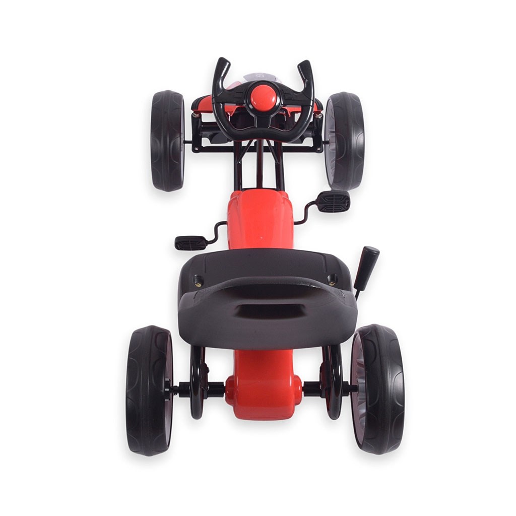 Il veicolo è realizzato con una struttura metallica leggera e materiali plastici di alta qualità per garantire lunga durata e resistenza ai danni. È dotato di un sistema di trasmissione a catena con pedali e grandi ruote resistenti con pneumatici in schiuma (EVA) per una buona aderenza e comfort su diverse superfici. Il manubrio sportivo ergonomico consente una presa salda e una facile manovrabilità, mentre il sedile sagomato offre una guida confortevole. È anche dotato di freno di emergenza manuale.
