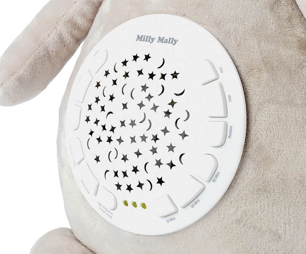 È possibile impostare la durata desiderata: 30, 60, 90 minuti. Sono disponibili 5 livelli di volume. Un ottimo complemento alla sua funzione è rappresentato da 5 tipi di rumore bianco, che hanno un effetto particolarmente calmante sul bambino, permettendogli di rilassarsi e addormentarsi più rapidamente. Con questo giocattolo sentirete suoni delicati: il gorgoglio dell'acqua con canti di uccelli, il battito del cuore, il gocciolare dell'acqua, il canto degli uccelli o la pioggia che cade.