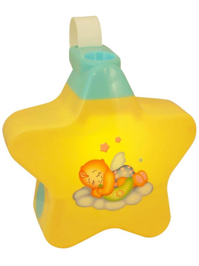 Proiettore musicale per neonati. Il proiettore a forma di stella proietta sul soffitto bellissime immagini di stelle e di un orsetto, suonando 3 ninnenanne. Tutto ciò aiuterà il tuo piccolo a prendere sonno in modo affidabile. La stella può essere fissata al lettino con un nastro di plastica o lasciata in piedi liberamente. Sul proiettore c'è un pulsante per accendere e spegnere ON/OFF. La posizione del pulsante ON ha due opzioni che determinano il volume delle melodie. Il proiettore ha un pulsante separato per accendere la musica e un pulsante separato per accendere le immagini in movimento. Tutto può essere acceso insieme o separatamente. Realizzato in plastica di alta qualità. Adatto per bambini dalla nascita. Le batterie sono incluse nella confezione. Dimensioni circa 15x15 cm.