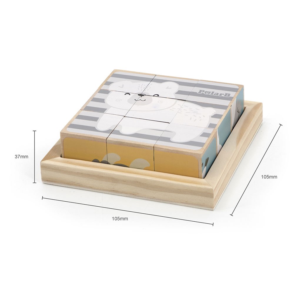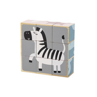 Sviluppa le abilità del tuo bambino con un giocattolo classico fatto di cubi di legno. Con 9 cubi, il tuo bambino potrà creare su una base di legno 6 immagini che rappresentano questi animali: una zebra, un koala, un orso, un elefante, un pulcino e un riccio.