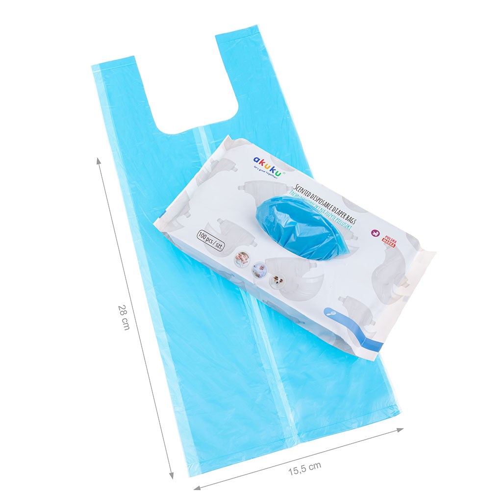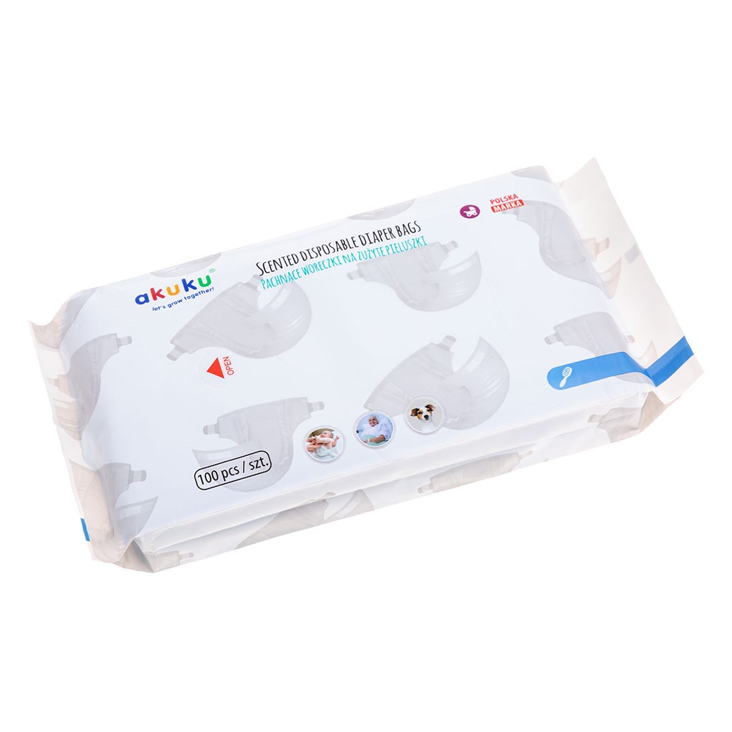 Set di sacchetti profumati monouso, progettati per garantire la rimozione igienica dei pannolini usati, fazzoletti o asciugamani per bambini. Questo pratico accessorio non dovrebbe mancare mai nel fasciatoio, nella borsa o nel passeggino durante una passeggiata. Sono abbastanza grandi per adattarsi a tutte le dimensioni dei pannolini. La confezione è dotata di una chiusura semplice e contiene 100 sacchetti.