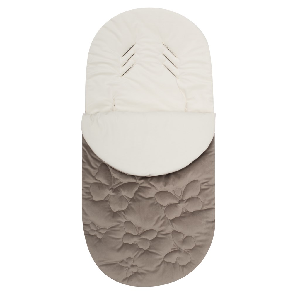 Sacco invernale per bambini del marchio ceco New Baby Butterfly, ideale per passeggini e seggiolini auto. Il sacco per bambini è dotato di aperture per le cinture di sicurezza a 5 punti, garantendo la massima sicurezza durante i viaggi. Il sacco con zip consente un comodo riposizionamento del bambino all'interno. La zip può essere aperta anche lungo tutta la parte inferiore, permettendo di utilizzare il sacco come tappetino. L'interno del sacco è realizzato in morbido e piacevole velluto. Il lato esterno è in materiale scamosciato al tatto, decorato con farfalle.