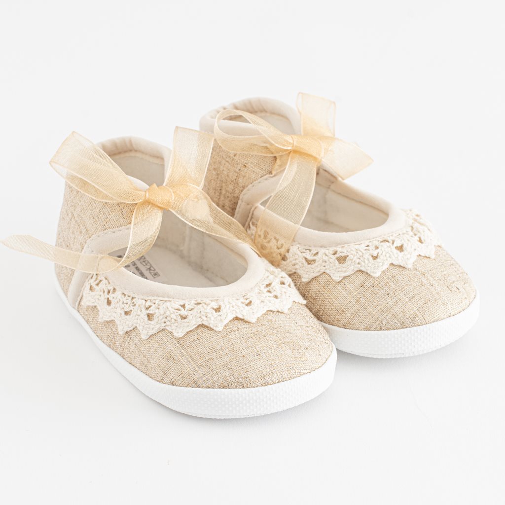 Scarpine per neonati New Baby. Bellissime scarpine in stile sandali da ragazza con un look moderno e allacciabili. Le scarpine aderiscono al piedino e hanno un'ampia interni, che consente la libertà di movimento delle dita e dei muscoli. Il prodotto non è destinato alla camminata. Sono molto leggere con una soletta sintetica sottile. Composizione: tulle: 100% poliestere. Suola: materiale sintetico PVC senza BPA. Lunghezza della soletta interna 10 cm. Destinato a bambini da 0 a 3 mesi. Confezionato in una pratica scatola. Nota: sotto la soletta in tessuto a volte si trova una soletta di carta che mantiene la forma della scarpina. Rimuovere questa soletta di carta prima del primo utilizzo.