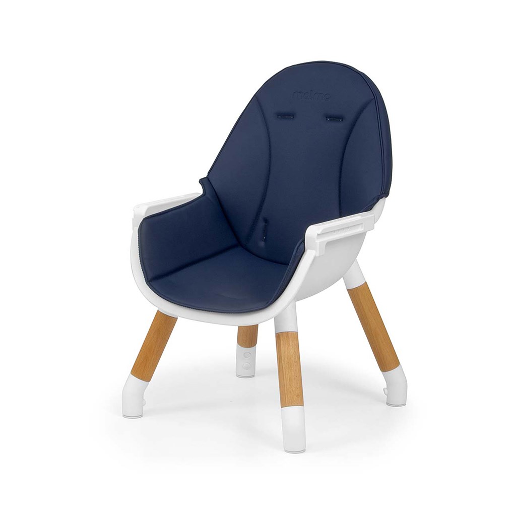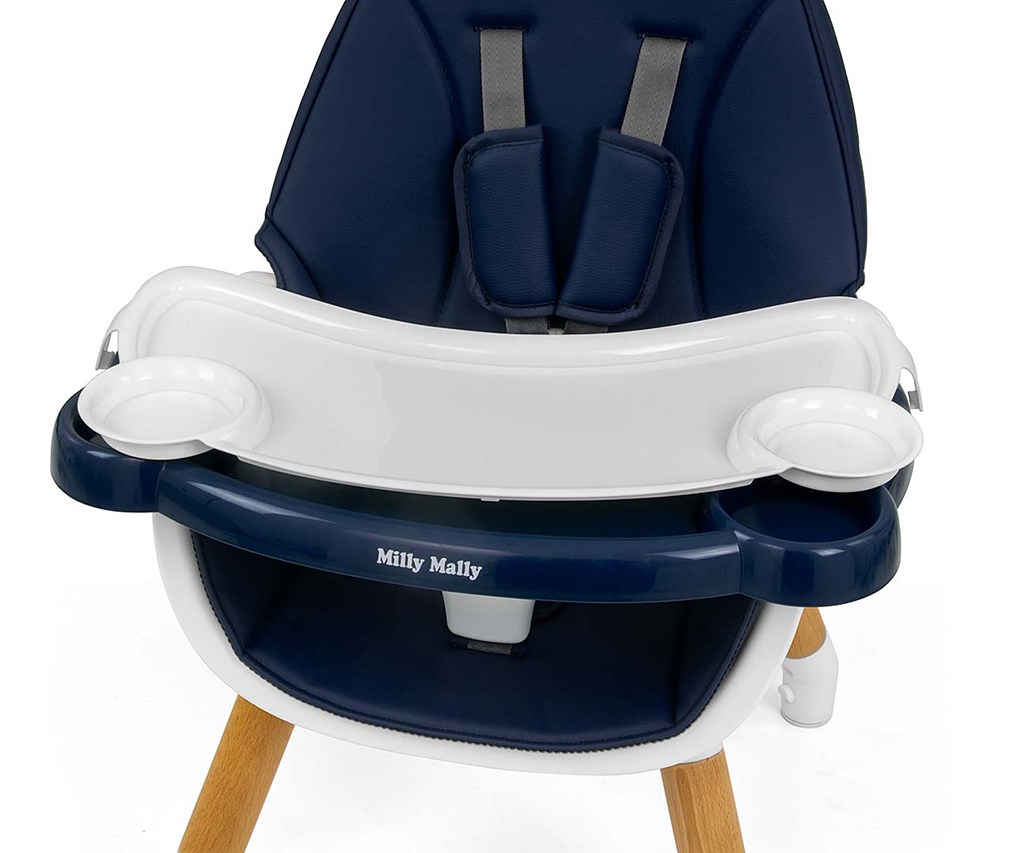 Le cinture di sicurezza a cinque punti, dotate di spallacci larghi e morbidi, proteggono il bambino da graffi. L'imbottitura della sedia Malmo in ecopelle è resistente allo sporco e facile da pulire. Il vassoio ha una depressione che evita lo scivolamento degli oggetti.