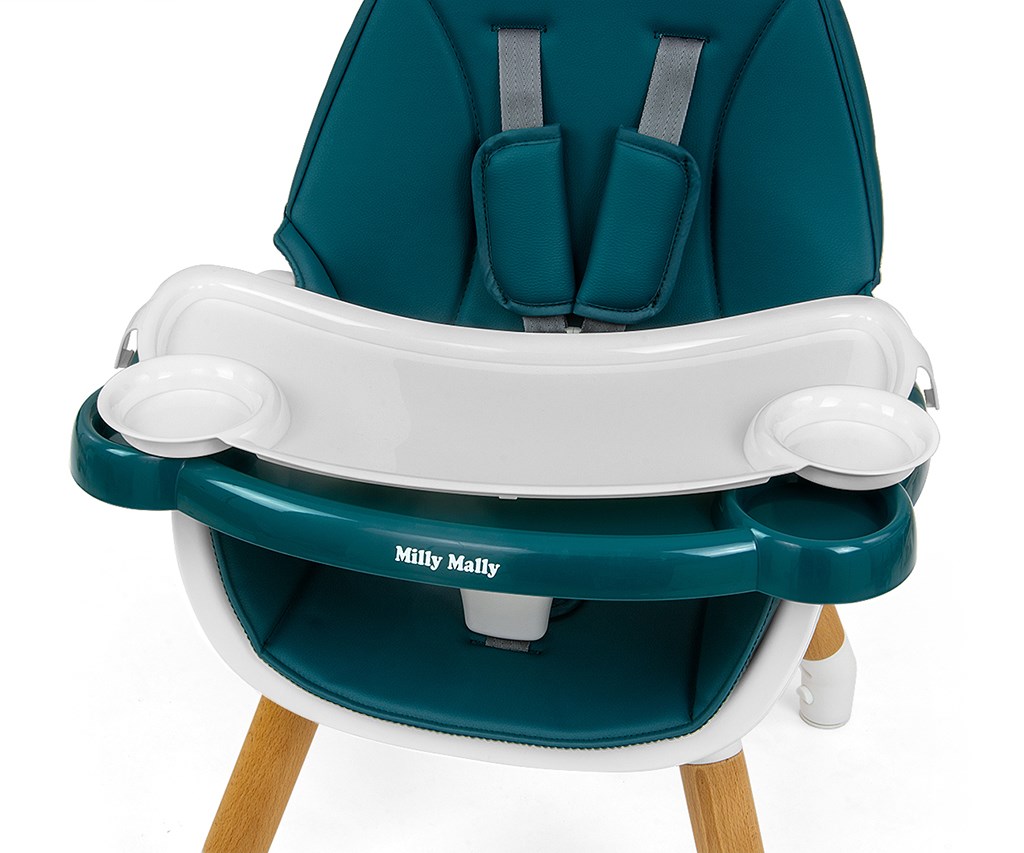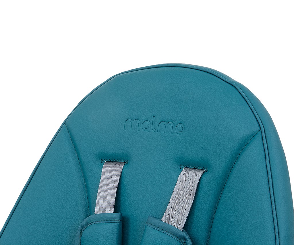 Le cinture di sicurezza a cinque punti, dotate di spallacci larghi e morbidi, proteggono il bambino da graffi. L'imbottitura della sedia Malmo in ecopelle è resistente allo sporco e facile da pulire. Il vassoio ha una depressione che evita lo scivolamento degli oggetti.