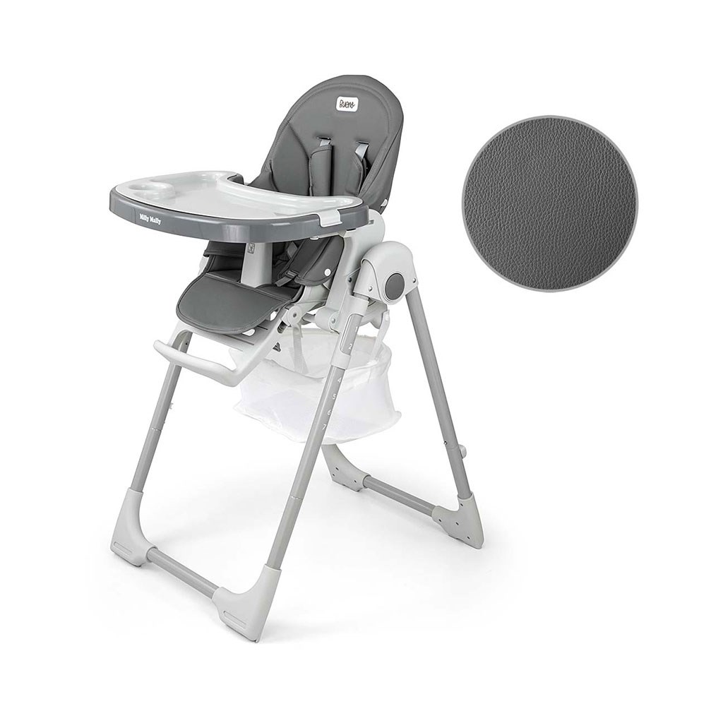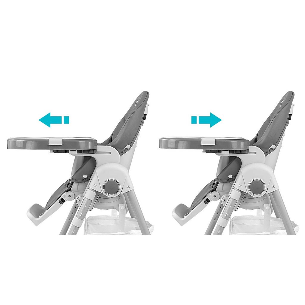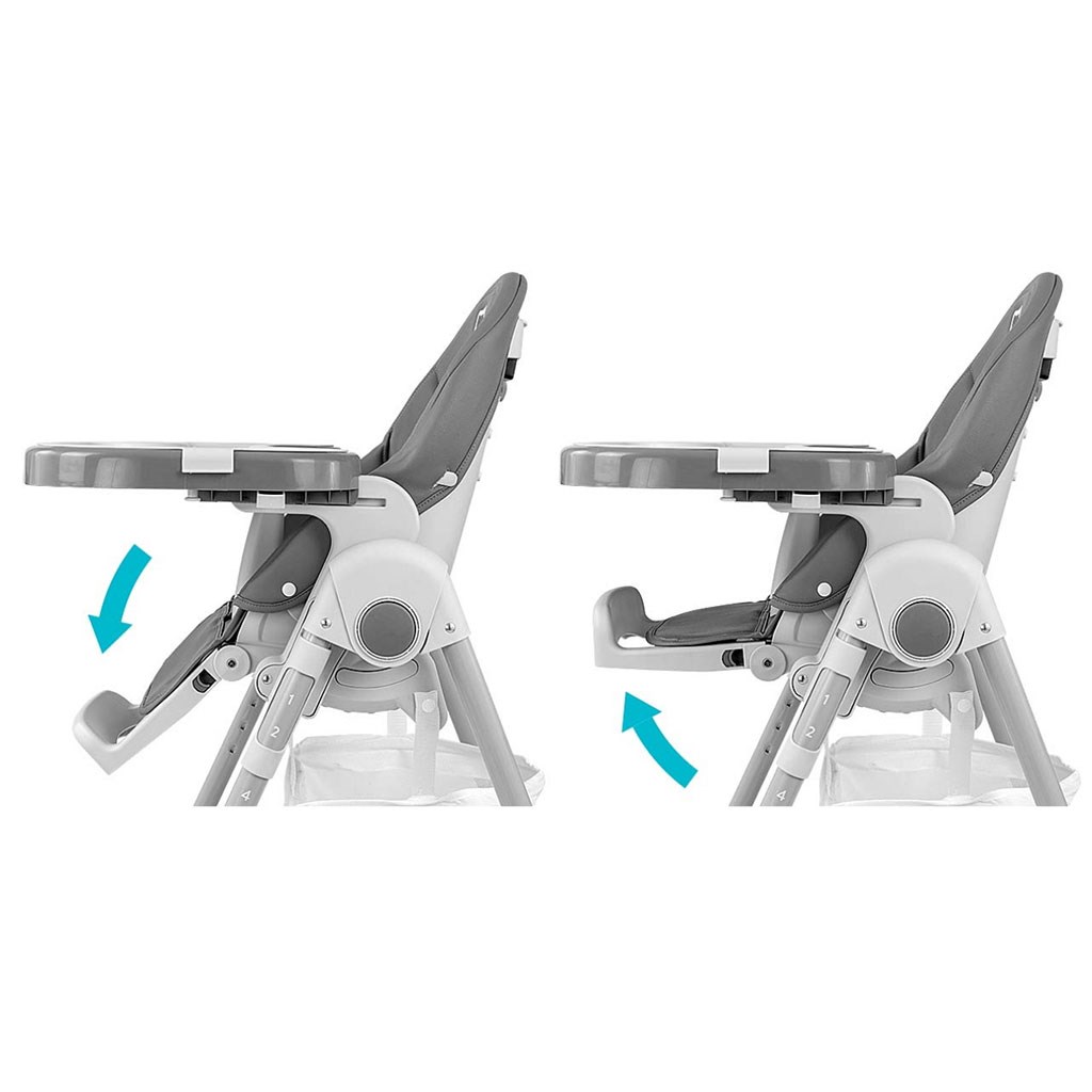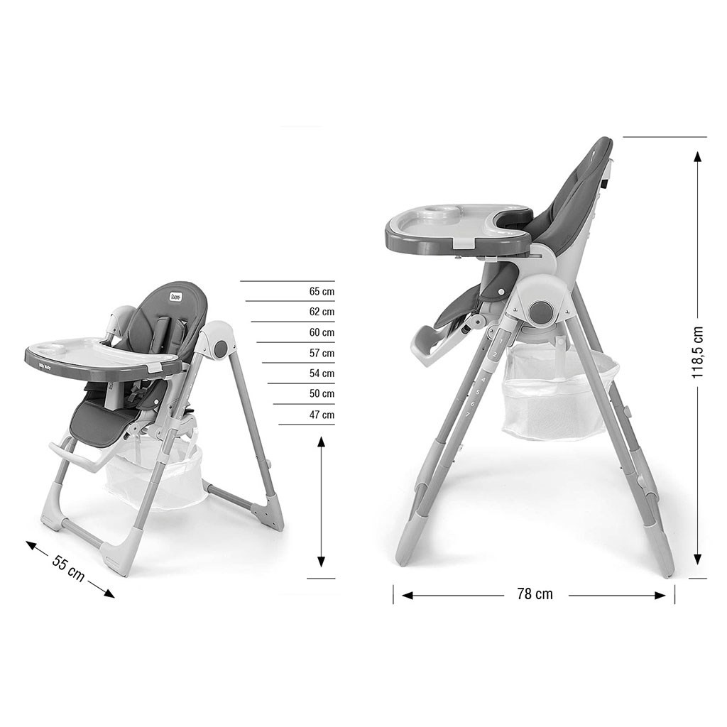 La seduta è rivestita in ecopelle ed è dotata di un morbido inserto per i più piccoli. Per la sicurezza del bambino, è fornita di cinture di sicurezza a 5 punti regolabili e di una barriera aggiuntiva contro le scivolate. Sul retro dello schienale è presente una maniglia per appendere il vassoio. Lo schienale e il poggiapiedi possono essere reclinati completamente. L'altezza della seduta può essere regolata su 7 livelli e le gambe sono dotate di ruote in gomma integrate. L'intera struttura può essere facilmente e rapidamente piegata.