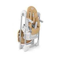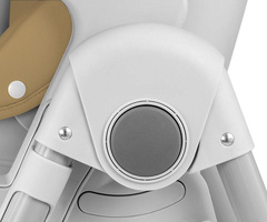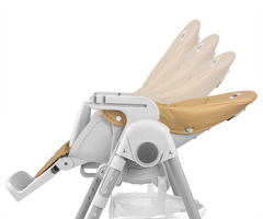 La seduta è rivestita in ecopelle ed è dotata di un morbido inserto per i più piccoli. Per la sicurezza del bambino, è fornita di cinture di sicurezza a 5 punti regolabili e di una barriera aggiuntiva contro le scivolate. Sul retro dello schienale è presente una maniglia per appendere il vassoio. Lo schienale e il poggiapiedi possono essere reclinati completamente. L'altezza della seduta può essere regolata su 7 livelli e le gambe sono dotate di ruote in gomma integrate. L'intera struttura può essere facilmente e rapidamente piegata.