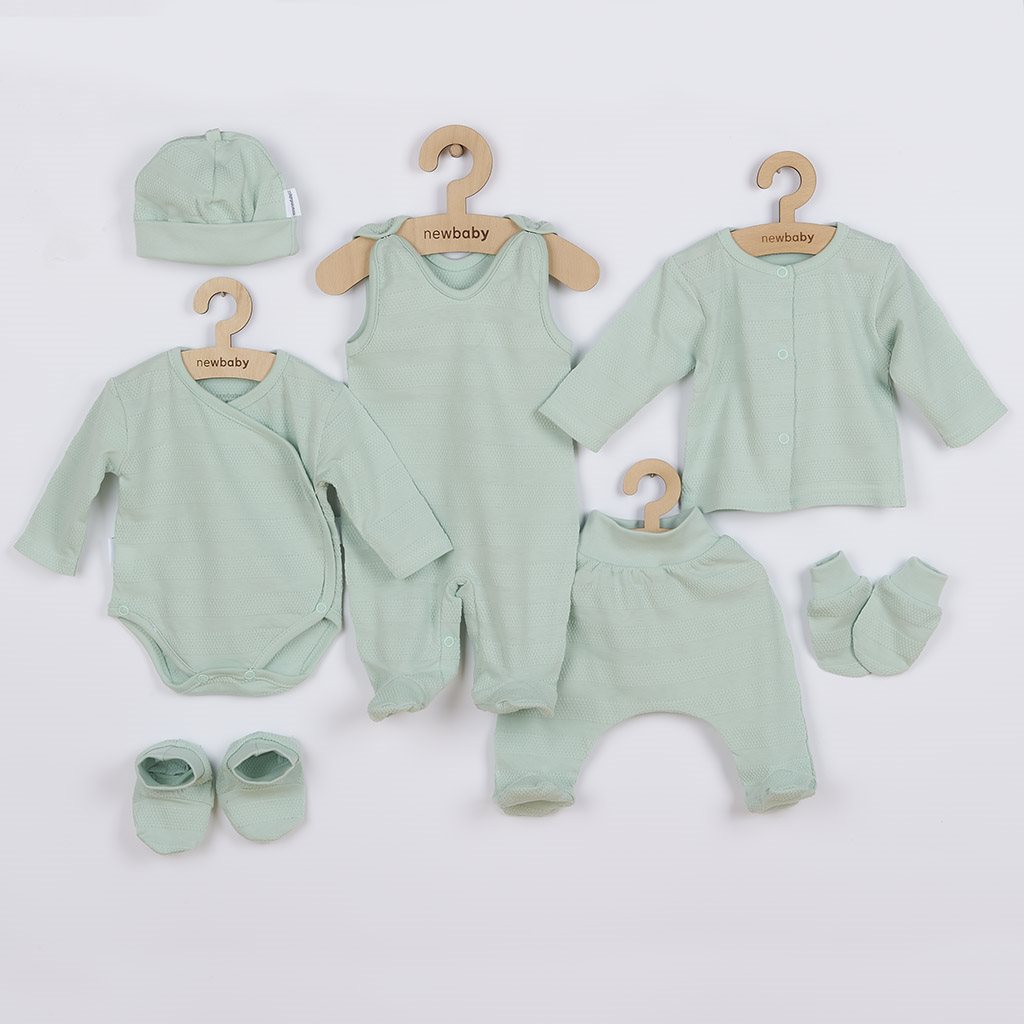 Delizioso completino per neonati da 7 pezzi del marchio ceco New Baby I AM per i più piccoli. Il completino è realizzato in un materiale molto morbido, piacevole e di alta qualità, adatto ai neonati e ideale non solo per l'ospedale. Include un body con apertura completa e maniche lunghe, salopette, pantaloni, giacca, cappellino, guanti e scarpine. Il body ha un'apertura laterale lungo tutta la lunghezza e bottoni tra le gambe. Le salopette si chiudono con bottoni sulle spalle e tra le gambe, facilitando così il vestirsi e il cambio. La giacca si allaccia con bottoni lungo tutta la lunghezza. Il cappellino con orlo più ampio si tiene bene sulla testa del neonato e non cade. È molto pratico e non esercita pressione sulla testolina del bambino. I guanti e le scarpine hanno una manichetta più ampia per una vestibilità comoda. L'intero completino presenta un nuovo design eccezionale con un motivo di tessuto attraente. È progettato tenendo conto delle esigenze del bambino ed è adatto anche come un regalo gentile. Il completino è confezionato in una pratica scatola Eco. Composizione: 100% cotone.