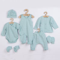 Delizioso completino per neonati da 7 pezzi del marchio ceco New Baby I AM per i più piccoli. Il completino è realizzato in un materiale molto morbido, piacevole e di alta qualità, adatto ai neonati e ideale non solo per l'ospedale. Include un body con apertura completa e maniche lunghe, salopette, pantaloni, giacca, cappellino, guanti e scarpine. Il body ha un'apertura laterale lungo tutta la lunghezza e bottoni tra le gambe. Le salopette si chiudono con bottoni sulle spalle e tra le gambe, facilitando così il vestirsi e il cambio. La giacca si allaccia con bottoni lungo tutta la lunghezza. Il cappellino con orlo più ampio si tiene bene sulla testa del neonato e non cade. È molto pratico e non esercita pressione sulla testolina del bambino. I guanti e le scarpine hanno una manichetta più ampia per una vestibilità comoda. L'intero completino presenta un nuovo design eccezionale con un motivo di tessuto attraente. È progettato tenendo conto delle esigenze del bambino ed è adatto anche come un regalo gentile. Il completino è confezionato in una pratica scatola Eco. Composizione: 100% cotone.