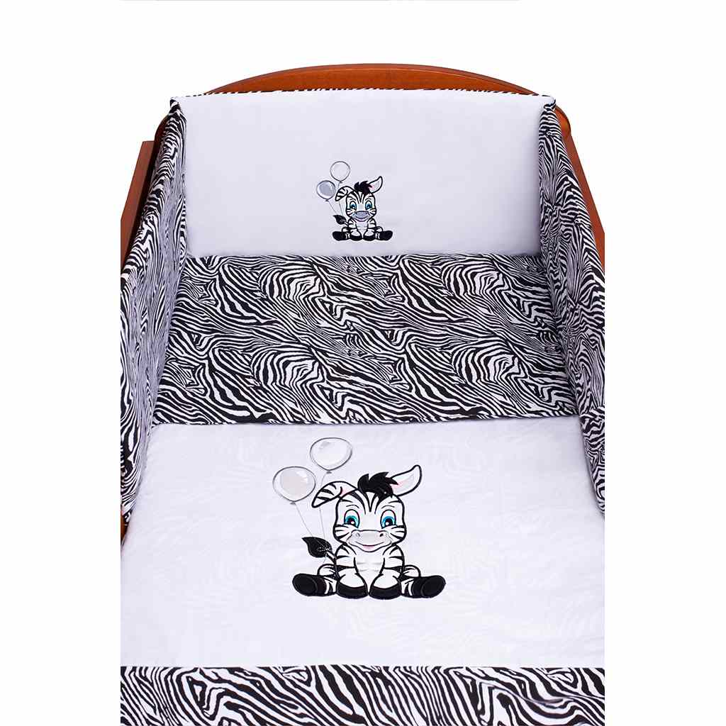 Set di biancheria da culla 3 pezzi New Baby Zebra per neonati. Il set è decorato con un'allegrissima immagine di una zebra a righe ed è interamente stampato con vivaci righe in bianco e nero. È realizzato in materiale morbido e piacevole al tatto. Il set include una federa per cuscino di circa 40x60 cm, una copertura per piumone di circa 100x135 cm e un paracolpi di circa 180 cm. Materiale 100% cotone.