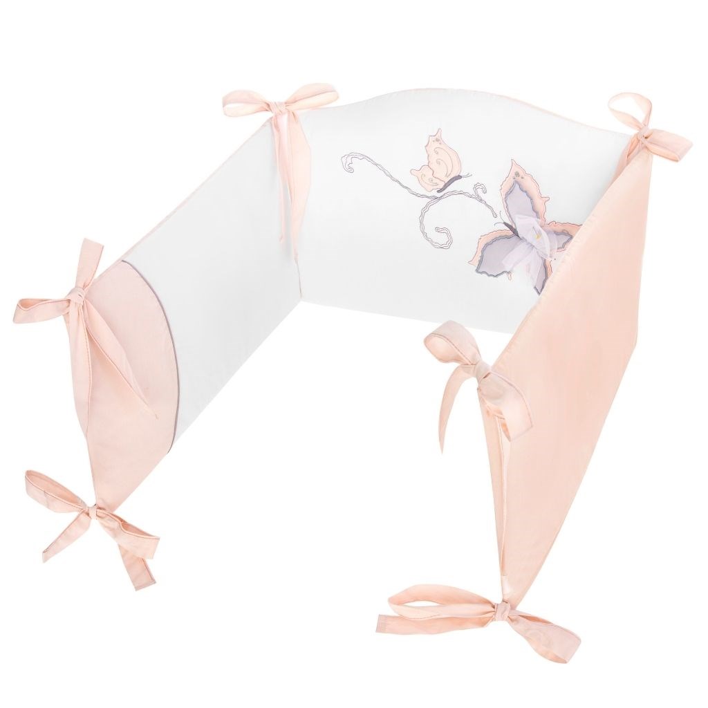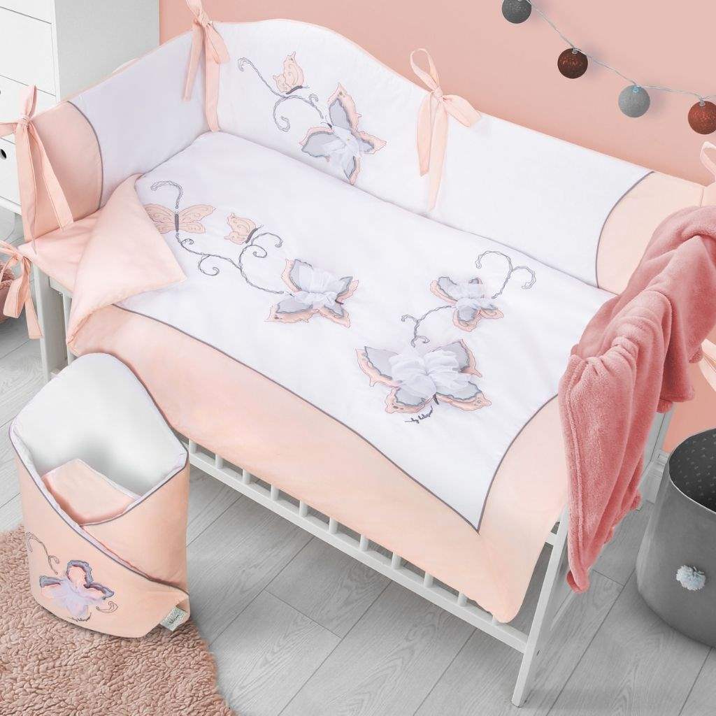 Bellissimo set di lettino in cotone 6 pezzi Belisima Butterfly per neonati. Realizzato in morbido e piacevole materiale. Il set include una federa per cuscino di circa 40x60 cm, una copertura per la coperta di circa 100x135 cm, un paracolpi di circa 180 cm, l'imbottitura per il cuscino e la coperta, e un velo. Materiale 100% cotone.