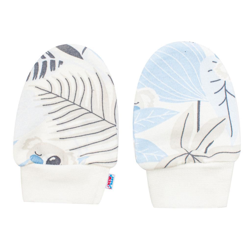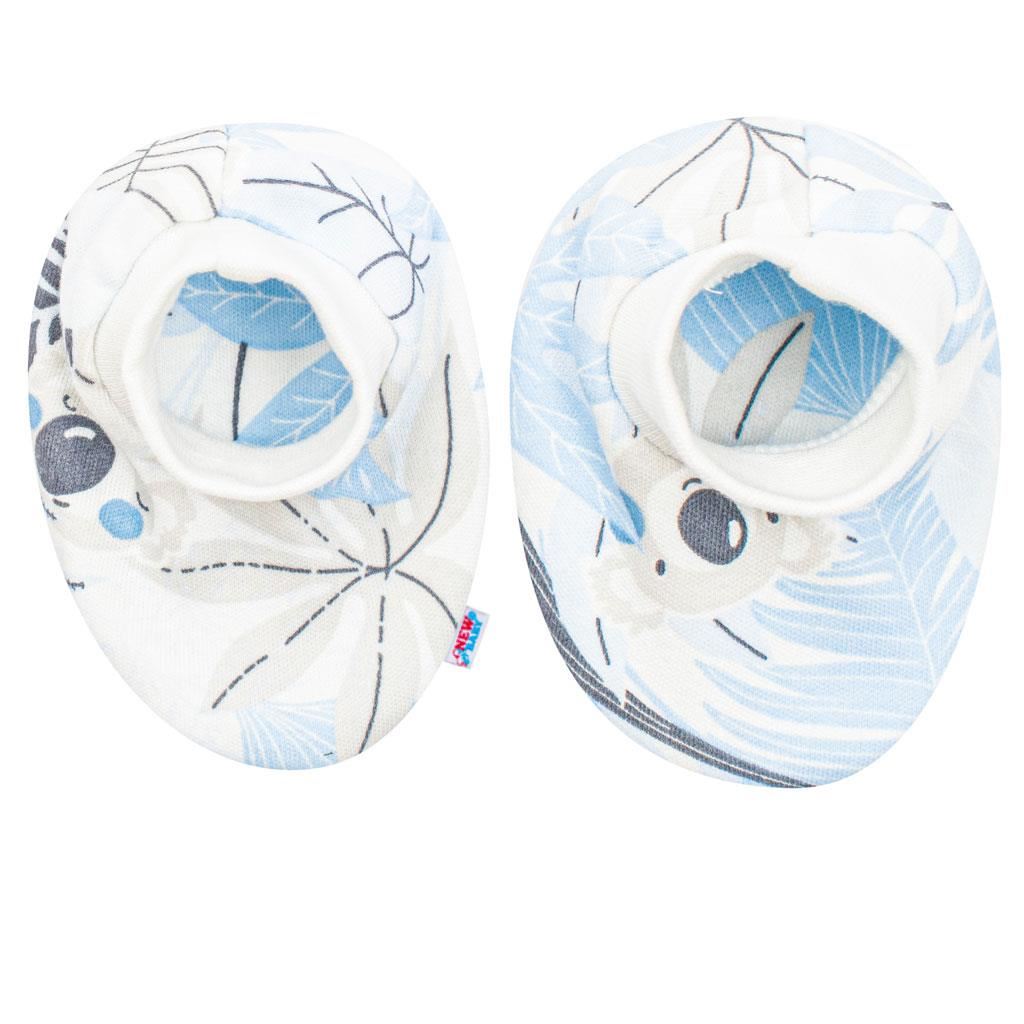 Bellissimo e pratico set in cotone del marchio ceco New Baby Lovely. Il set è composto da scarpine e guanti. Le scarpine e i guanti sono decorati con un adorabile motivo e hanno polsini regolabili. Composizione: 100% cotone.