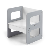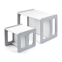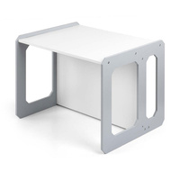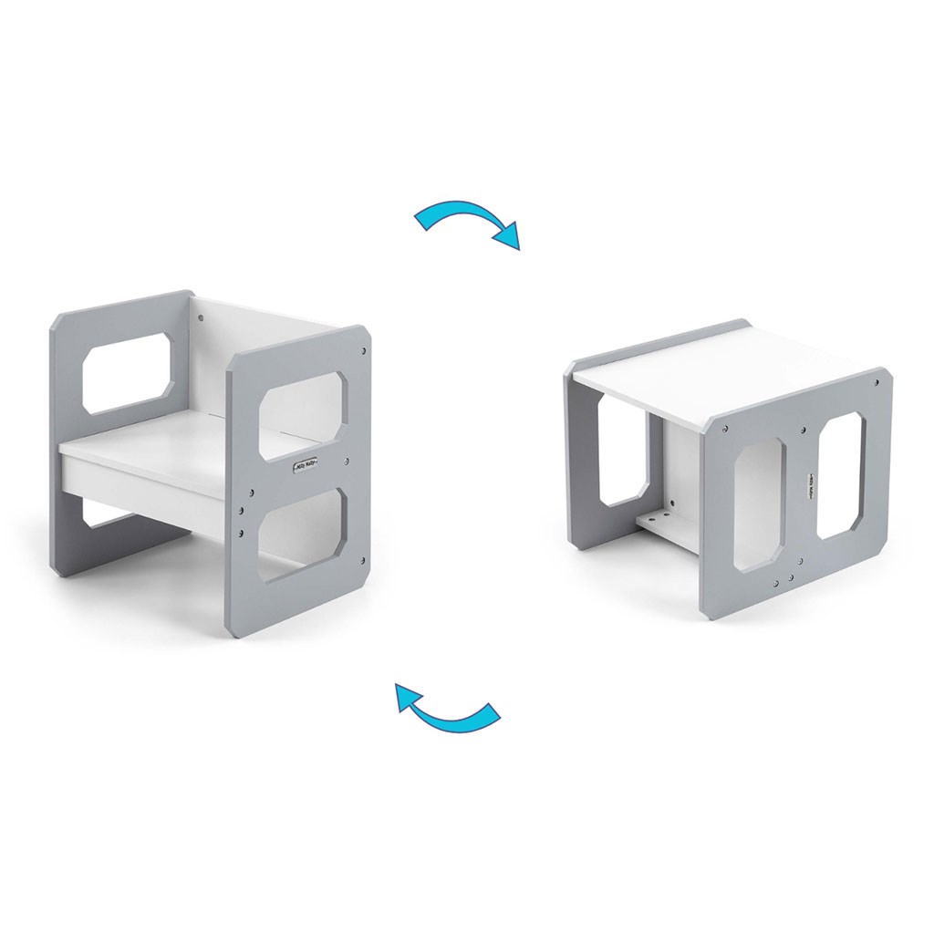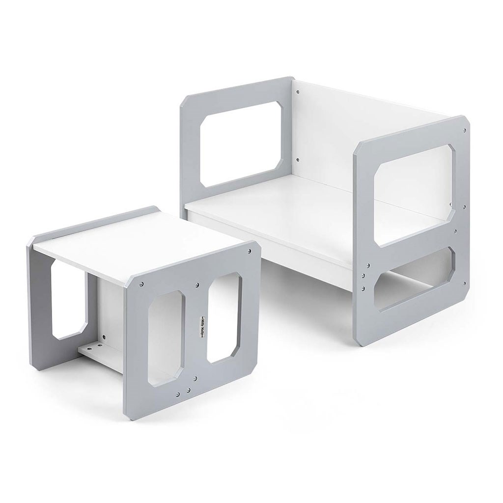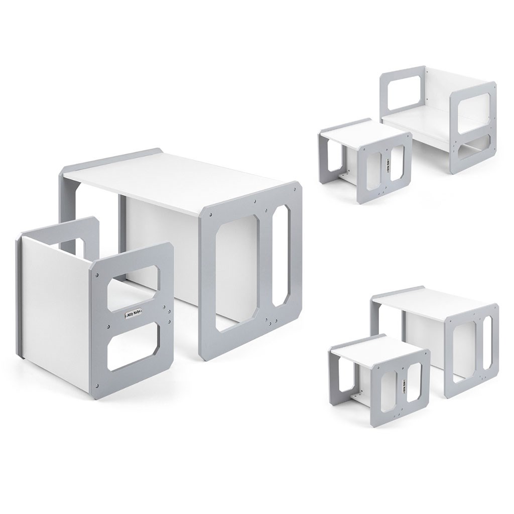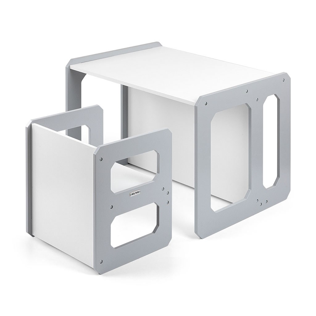 Il set è composto da un tavolo e una sedia, che grazie alla loro costruzione modulare possono svolgere diverse funzioni: il tavolo può essere trasformato in una seduta più grande e la sedia si adatta perfettamente come tavolino più piccolo o come seduta senza schienale per un bambino più grande. Grazie alla sua leggera struttura, questo mobile è facilmente trasportabile, consentendo ai bambini di adattarlo alle proprie esigenze.