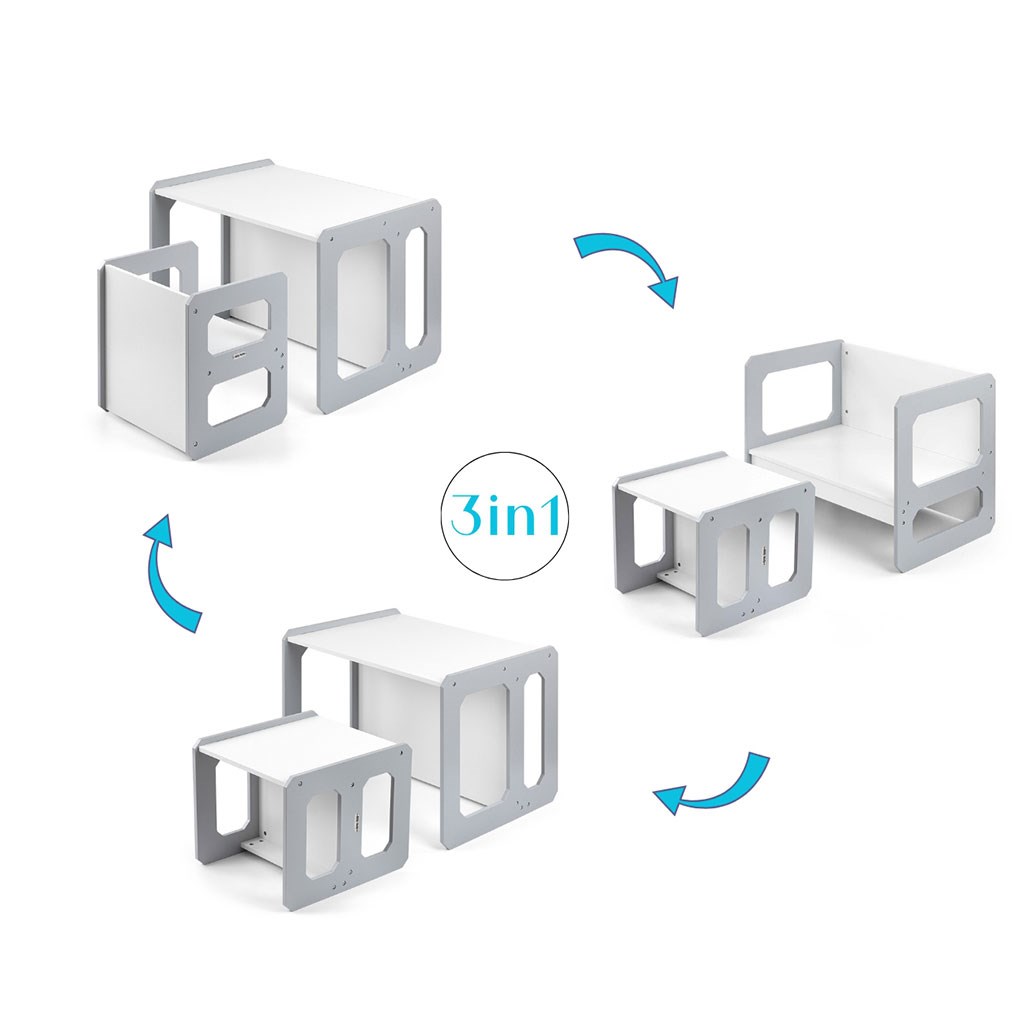 Set di mobili 3 in 1 Stella in una combinazione di colori bianca e grigia con accessori grigi, progettato per garantire ai bambini: conforto, spazio per il gioco creativo, per dipingere, scrivere e il massimo comfort durante le attività.