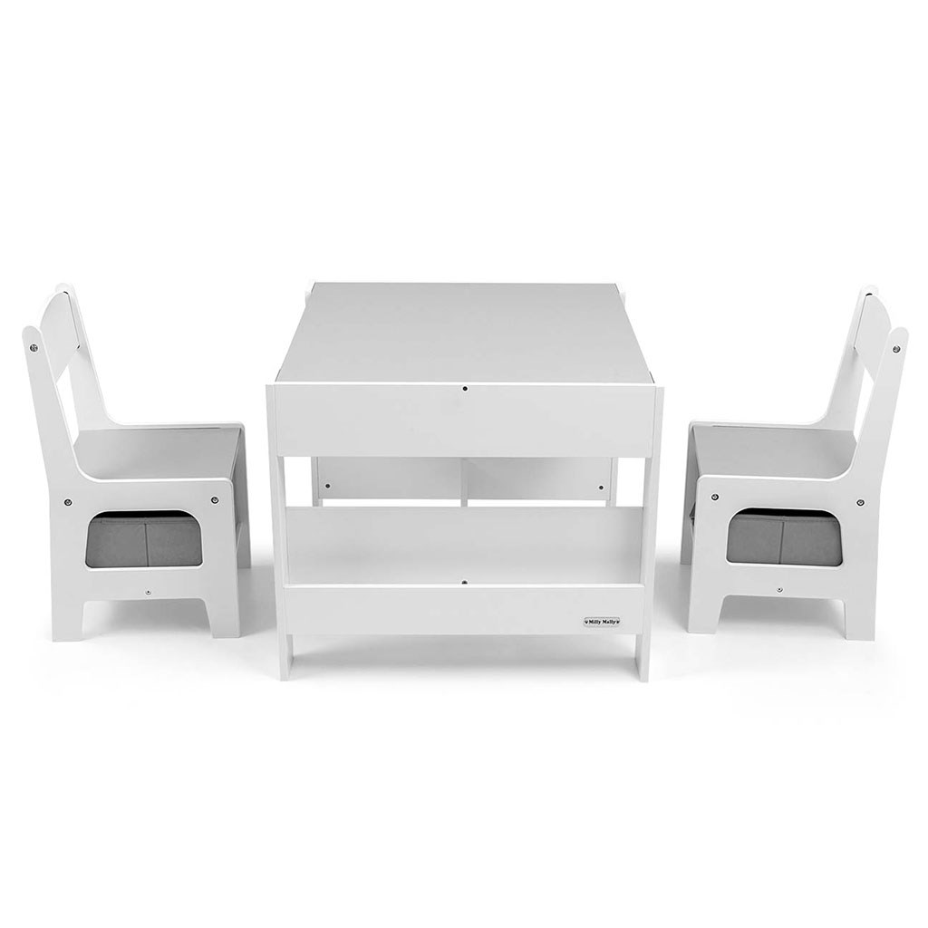 Set di mobili multifunzionali per bambini. Il tavolo SVEN con 2 sedie in bianco e grigio con accessori grigi è progettato per offrire ai bambini: comfort, spazio per il gioco creativo, disegno, scrittura e il massimo del comfort nelle attività. Il set include 2 sedie con 2 contenitori in tessuto che si inseriscono nello scaffale sotto le sedie. Il tavolo è dotato di un enorme spazio di archiviazione situato sotto la superficie rimovibile doppia. Ha anche scaffali laterali per la conservazione. Da un lato del tavolo c'è una grande lavagna per disegnare. Le sedie sono leggere e i bambini possono spostarle liberamente. I mobili sono realizzati con eccezionale precisione e cura. Entrambe le sedie hanno angoli arrotondati che proteggono i bambini da infortuni. Tutti gli elementi della struttura del tavolo e delle sedie garantiscono alta stabilità e minimizzano il rischio di cadute. Il set Sven realizzato in MDF è resistente e facile da mantenere. Il set di mobili è facile da assemblare e tutti i componenti necessari per il montaggio sono inclusi nella confezione.