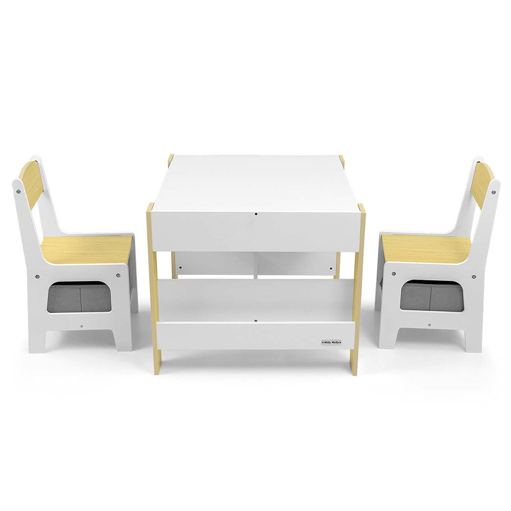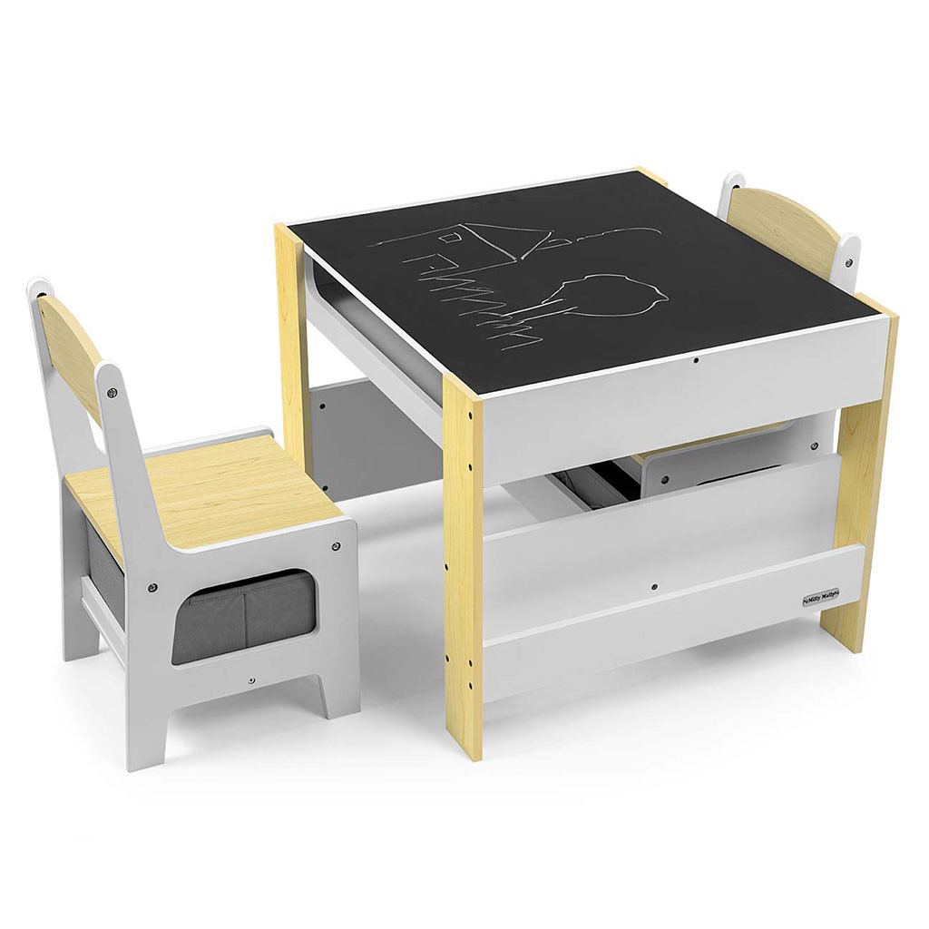 Set di mobili multifunzionali per bambini. Il tavolo SVEN con 2 sedie in bianco e grigio con accessori grigi è progettato per offrire ai bambini: comfort, spazio per il gioco creativo, disegno, scrittura e il massimo del comfort nelle attività. Il set include 2 sedie con 2 contenitori in tessuto che si inseriscono nello scaffale sotto le sedie. Il tavolo è dotato di un enorme spazio di archiviazione situato sotto la superficie rimovibile doppia. Ha anche scaffali laterali per la conservazione. Da un lato del tavolo c'è una grande lavagna per disegnare. Le sedie sono leggere e i bambini possono spostarle liberamente. I mobili sono realizzati con eccezionale precisione e cura. Entrambe le sedie hanno angoli arrotondati che proteggono i bambini da infortuni. Tutti gli elementi della struttura del tavolo e delle sedie garantiscono alta stabilità e minimizzano il rischio di cadute. Il set Sven realizzato in MDF è resistente e facile da mantenere. Il set di mobili è facile da assemblare e tutti i componenti necessari per il montaggio sono inclusi nella confezione.