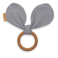 Giocattolo da mordere sicuro in legno di faggio naturale unito a una delicata stoffa in mussola. Allevia durante la dentizione e può servire anche come primo giocattolo.