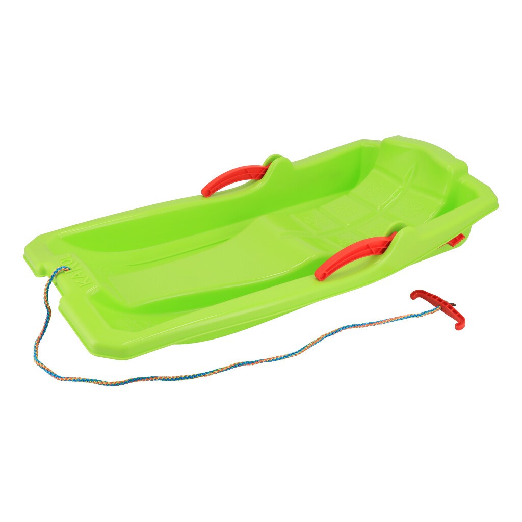 Sleigh in plastica con freni Baby Mix KAROL. Questo modello, grazie ai freni, consente un arresto sicuro, un controllo della direzione e minimizza le collisioni indesiderate durante le discese. È realizzato in plastica di alta qualità, resistente al freddo fino a -20 °C. È dotato di un cordino con maniglia.