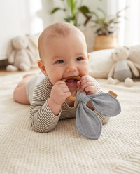 Il giocattolo da dentizione con panno in mussola è un set ideale quando il bambino inizia a mettere i denti. Il giocattolo è realizzato in legno di faggio sicuro e in morbido tessuto di mussola. Completamente sicuro per i bambini, offre un sollievo lenitivo durante la dentizione. Il giocattolo può essere utilizzato anche come giocattolo per i neonati. Si abbina perfettamente ai nostri altri prodotti in mussola, creando un bellissimo set da regalare per una festa di battesimo.