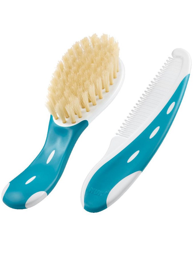 Spazzolino e pettine Nuk. Spazzolino per capelli in fibra naturale morbida con pettine. Lo spazzolino massaggia delicatamente il cuoio capelluto del bambino, stimolando la circolazione e rafforzando i capelli mantenendoli in ordine. Il pettine ha bordi arrotondati, facilitando la cura del bambino. L'impugnatura antiscivolo garantisce una presa comoda sia per il pettine che per lo spazzolino. Adatto per bambini dalla nascita.