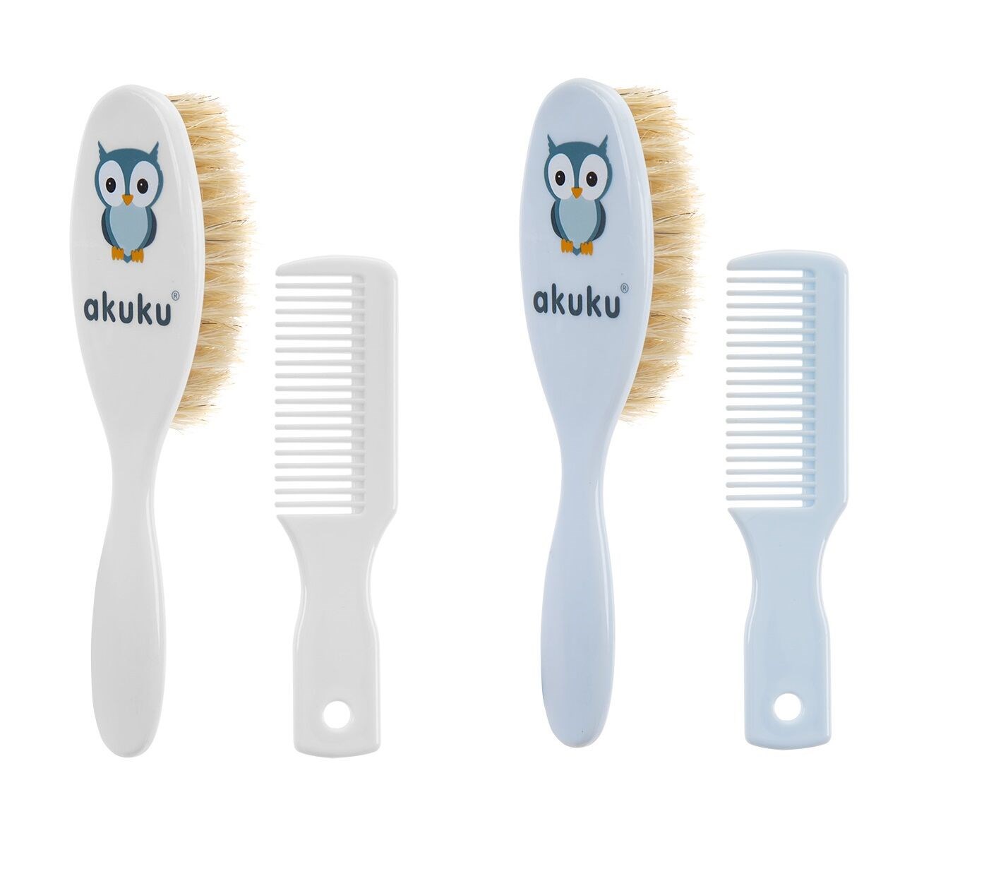 Spazzolino e pettine con setole naturali Akuku. Lo spazzolino massaggia delicatamente la pelle del cuoio capelluto del neonato, favorendo la circolazione e rinforzando i capelli. I denti arrotondati del pettine non irritano la pelle del cuoio capelluto. Realizzato senza BPA. Dimensioni: pettine: circa 11 cm, spazzolino: circa 15 cm. Adatto per neonati dalla nascita.
