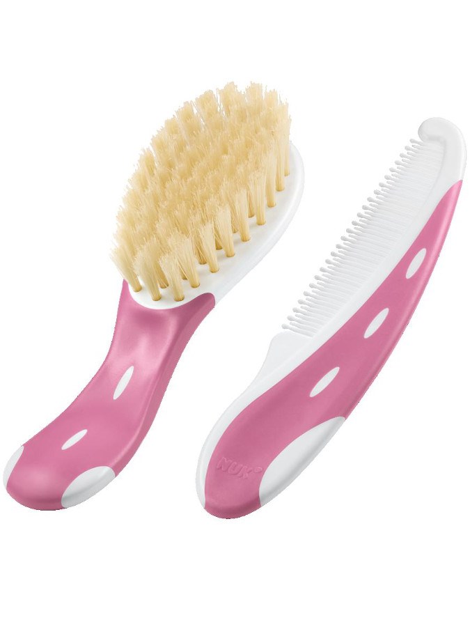 Spazzolino e pettine Nuk. Spazzolino per capelli in fibra naturale morbida con pettine. Lo spazzolino massaggia delicatamente il cuoio capelluto del bambino, stimolando la circolazione e rafforzando i capelli mantenendoli in ordine. Il pettine ha bordi arrotondati, facilitando la cura del bambino. L'impugnatura antiscivolo garantisce una presa comoda sia per il pettine che per lo spazzolino. Adatto per bambini dalla nascita.