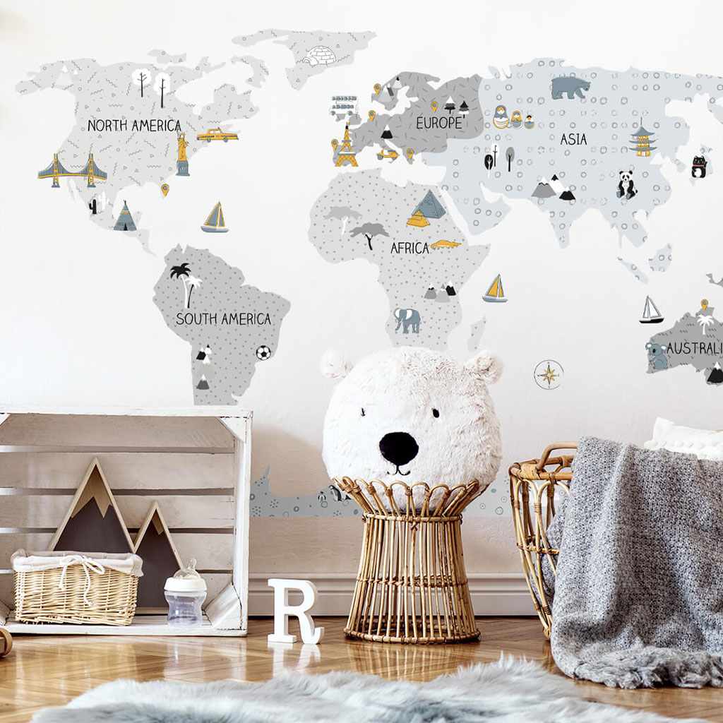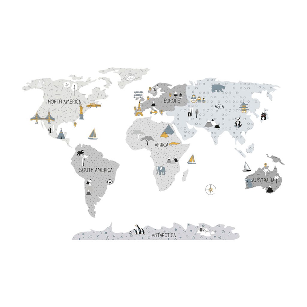 Bellissima decalcomania da parete Mappa M. Le mappe del mondo in grigio sono prodotti di alta qualità, realizzati con la massima cura e attenzione ai dettagli, mantenute in toni scandinaviami tenui, che si inseriscono perfettamente nello spazio del bambino. Le mappe non sono solo un'unica decorazione, ma anche un modo sensazionale di apprendere giocando. I bambini possono scoprire i continenti, gli oceani e i punti cardinali, ma anche monumenti e attrazioni della regione o dello stato in questione. Ogni elemento della mappa è tagliato con precisione e applicato separatamente, il che facilita l'applicazione, soprattutto in caso di spazi ampi. La dimensione della decalcomania viene misurata dopo la sua applicazione sulla parete, con i continenti distanziati adeguatamente. La decalcomania è protetta da un particolare laminato opaco, che la difende dai graffi durante l'uso quotidiano e allo stesso tempo facilita l'applicazione - la pellicola è più spessa e più facile da trasferire sulla parete. Se stai cercando il modo perfetto per dare vita alla stanza dei bambini, le nostre decalcomanie da parete sono la scelta giusta. Ordina oggi stesso e rendi felice il tuo bambino.