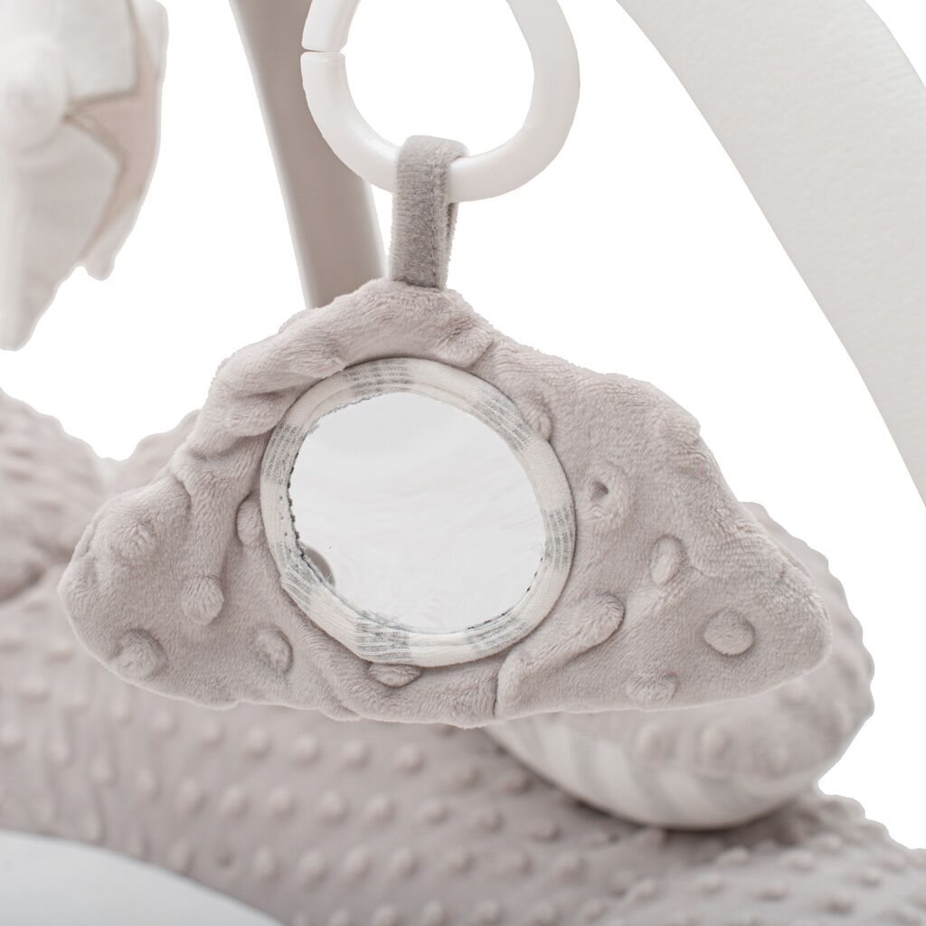 Il tappetino è dotato di un'archetto con giochi removibili, che possono essere posizionati a piacere o utilizzati separatamente. Ogni neonato troverà qualcosa di interessante: uno specchietto, elementi fruscianti, un sonaglio, un morbido dentaruolo, una campanella e un giocattolo con un lettore integrato che riproduce una piacevole melodia premendo un pulsante.