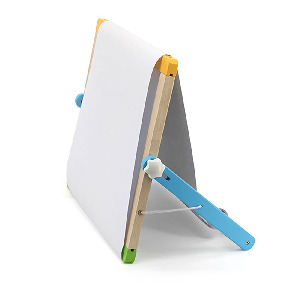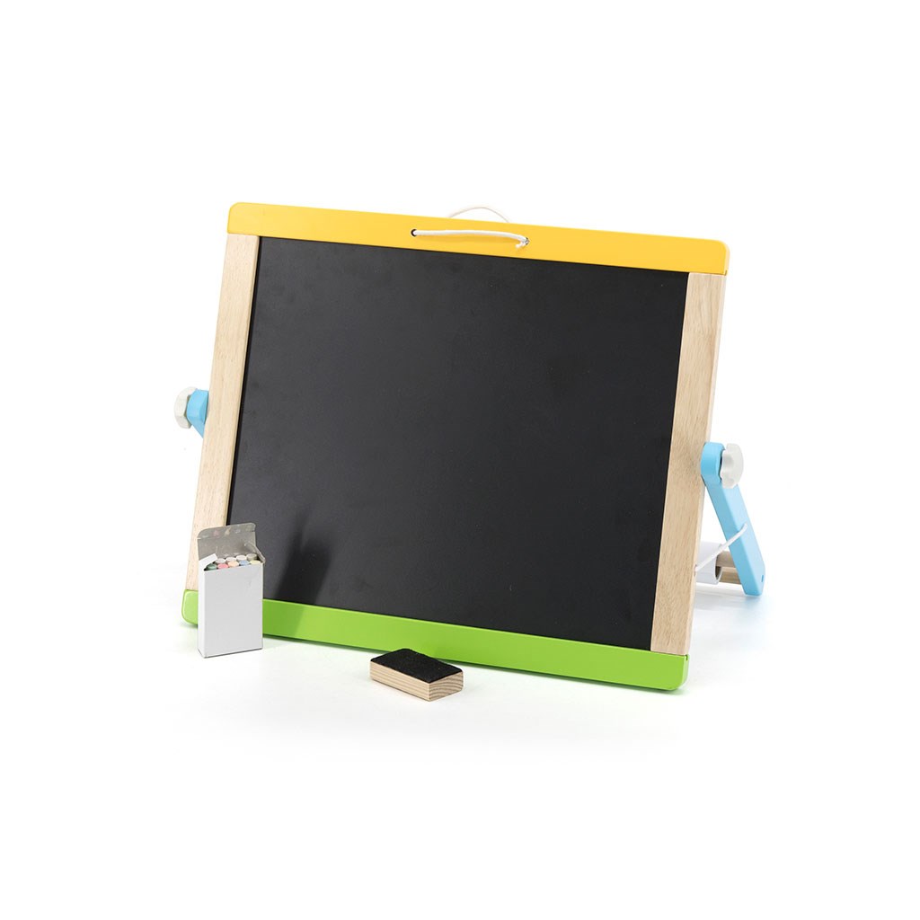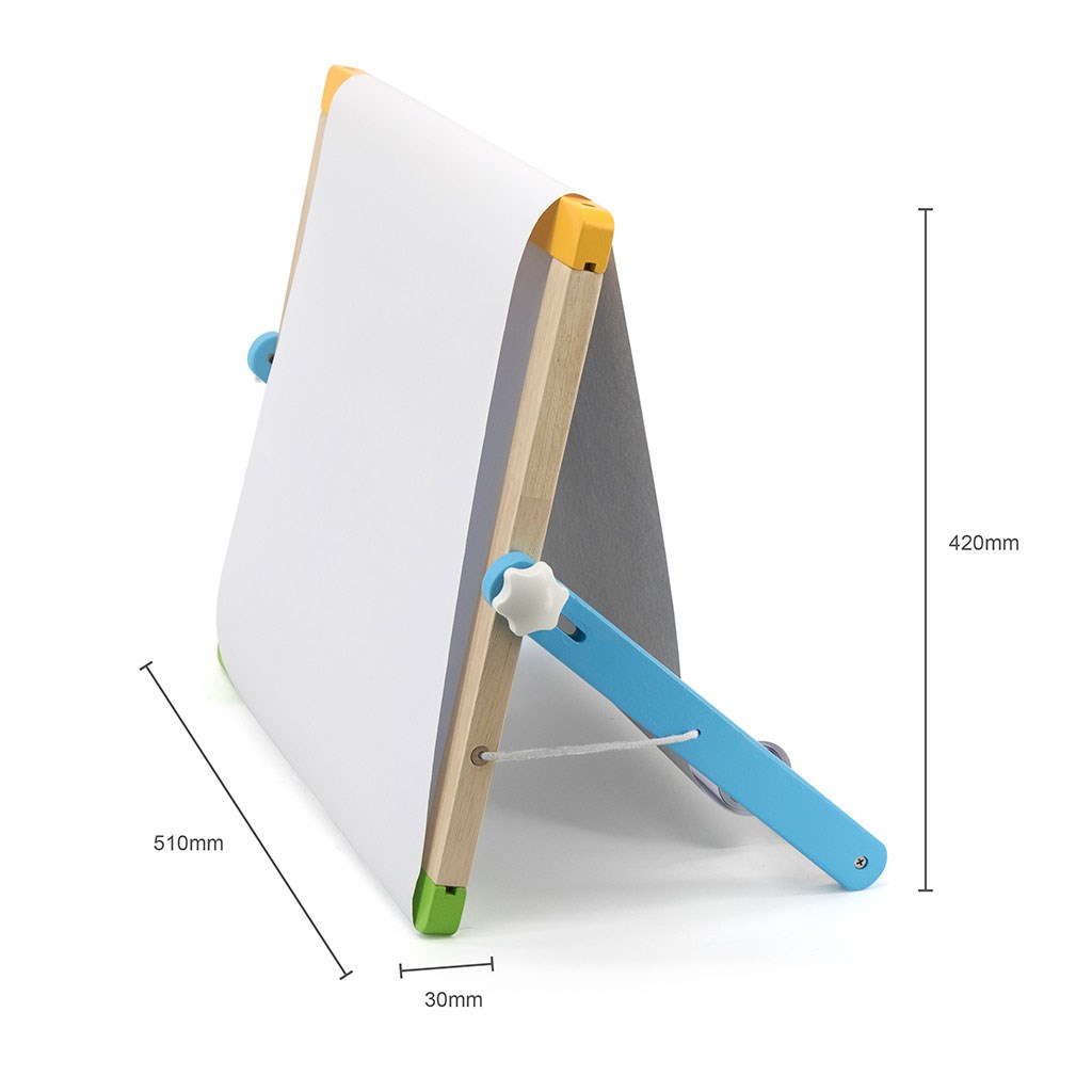 La lavagna doppia faccia con accessori è un prodotto multifunzionale che aiuta i bambini a imparare a contare, dipingere e scrivere. Da un lato c'è una lavagna magnetica, sulla quale è possibile attaccare i 26 magneti con lettere, i 29 magneti con figure geometriche e i 10 numeri inclusi, grazie a schede modello o alla propria fantasia. Inoltre, sulla lavagna è possibile scrivere con un pennarello. Dall'altro lato c'è una lavagna per gesso con una spugna. Sul retro della lavagna c'è anche un rotolo di carta che può essere srotolato sulla lavagna.