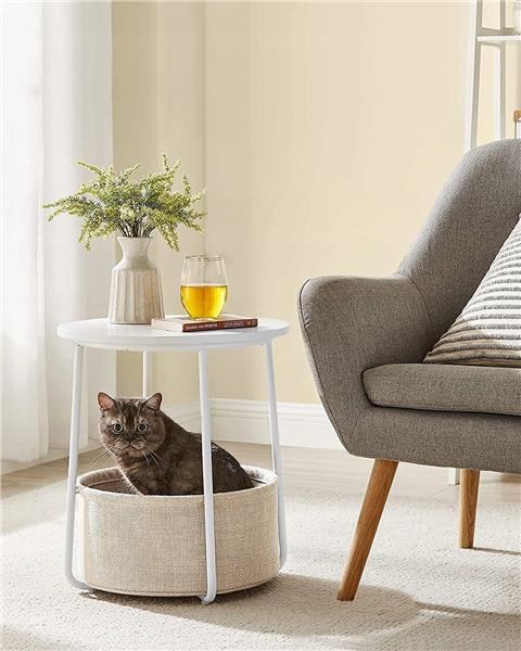 Le gambe in acciaio a forma di U garantiscono stabilità. I piedini regolabili aiutano a livellare il tavolo anche su pavimenti irregolari. Il cesto in tessuto poliestere a doppio strato consente di riporre vari oggetti. Il tessuto del cesto ricorda il lino, conferendo all'ambiente in cui è collocato il prodotto un tocco di eleganza.